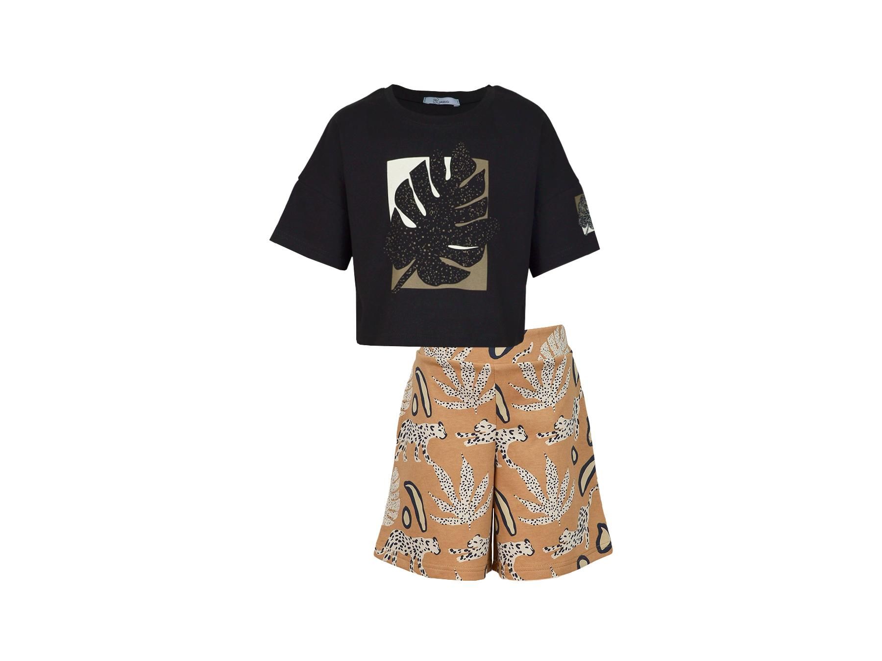 Шорты-укороченные с притачным поясом и резинкой.Два боковых кармана на переде,печать на левой передней половинке сбоку.