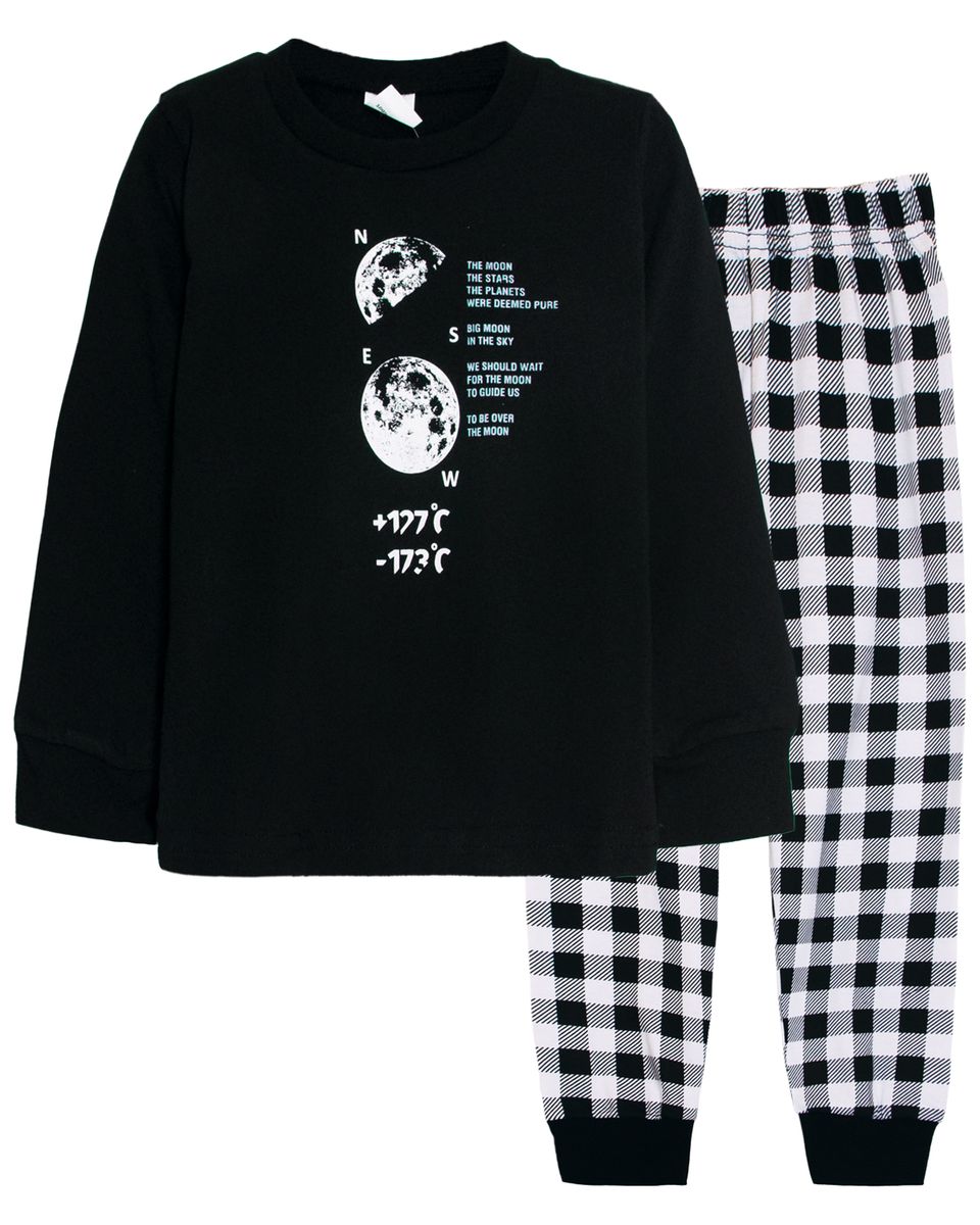 Пижама для мальчика, состоящая из джемпера и брюк. Джемпер прямого силуэта, с втачным длинным рукавом. Горловина круглая обработана воротником из рибаны. По низу рукавов манжеты из рибаны. Низ изделия обработан швом в подгибку. На полочке принт шелкография. Брюки прямого покроя, из набивного полотна. Пояс цельнокроенный, с эластичной тесьмой внутри. По низу изделия манжеты из рибаны.