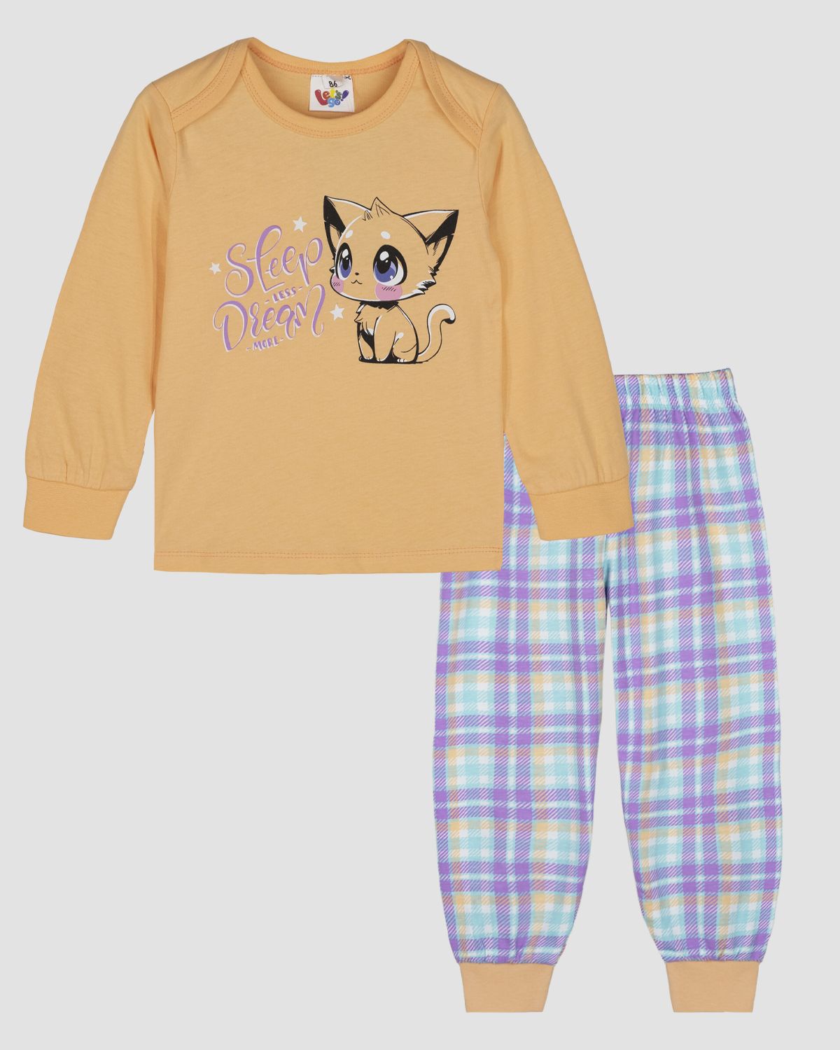 Пижама для девочки, состоящая из джемпера и брюк. Джемпер прямого силуэта с втачным длинным рукавом. Горловина круглая, окантована рибаной. Плечо с запахом, край запаха обработан рибаной. По низу рукавов манжеты из рибаны. Низ изделия обработан швом вподгибку. На полочке принт ШЕЛКОГРАФИЯ. Надпись переводится как "Спи меньше; Мечтай больше". Брюки прямого кроя из набивного полотна. Пояс цельнокроенный, с эластичной тесьмой внутри. По низу изделия манжеты из рибаны.