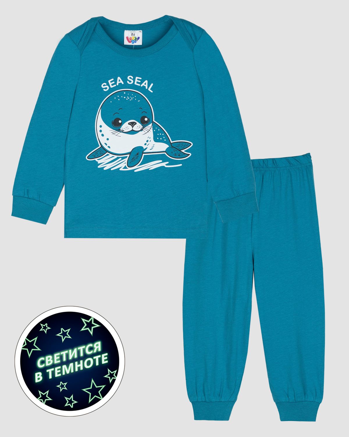 Пижама для мальчика, состоящая из джемпера и брюк. Джемпер прямого силуэта с втачным длинным рукавом. Горловина круглая, окантована рибаной. Плечо с запахом, край запаха обработан рибаной. По низу рукавов манжеты из рибаны. Низ изделия обработан швом вподгибку. На полочке принт ШЕЛКОГРАФИЯ С ФЛУОРЕСЦЕНТНОЙ КРАСКОЙ. Надпись переводится как "Морской тюлень". Брюки прямого кроя из однотонного полотна. Пояс цельнокроенный, с эластичной тесьмой внутри. По низу изделия манжеты из рибаны. ПРИНТ СВЕТИТСЯ В ТЕМНОТЕ.