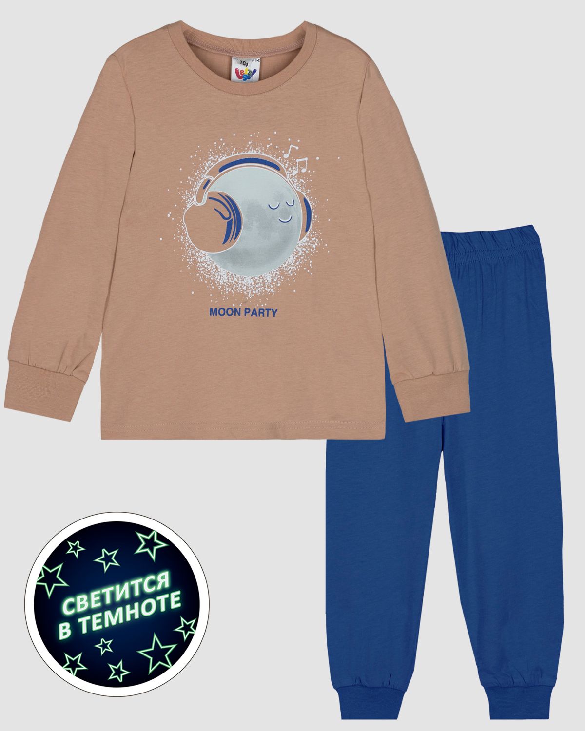 Пижама для мальчика, состоящая из джемпера и брюк. Джемпер прямого силуэта с втачным длинным рукавом. Горловина круглая, обработана воротником из рибаны. По горловине полочки и спинки отделочная строчка. По низу рукавов манжеты из рибаны. Низ изделия обработан швом в подгибку. На полочке принт ШЕЛКОГРАФИЯ С ФЛУОРЕСЦЕНТНОЙ КРАСКОЙ. Надпись переводится как "Лунная вечеринка". Брюки для мальчика прямого силуэта из однотонного полотна. Пояс цельнокроенный с эластичной тесьмой внутри. По низу изделия манжеты из рибаны. ПРИНТ СВЕТИТСЯ В ТЕМНОТЕ.