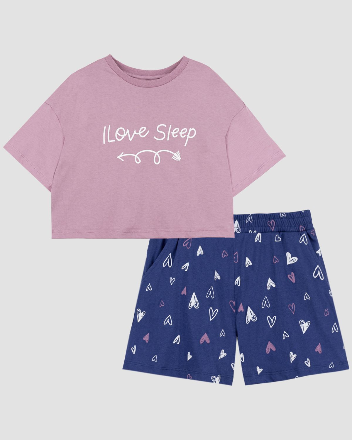 Пижама для девочки состоящий из футболки и шорт. Футболка укороченная прямого силуэта, со спущенным плечом коротким рукавом. Горловина круглая, обработана воротником из рибаны. Горловина спинки внутри укреплена бейкой из кулирки. Низ изделия и рукавов обработан швом в подгибку. На полочке принт ШЕЛКОГРАФИЯ. Надпись переводится как "Я люблю спать". Шорты из набивного полотна, прямого силуэта. Отрезной пояс из основного полотна. На передней половинке шорт выполнены карманы с отрезным бочком. Низ изделия обработан швом в подгибку.