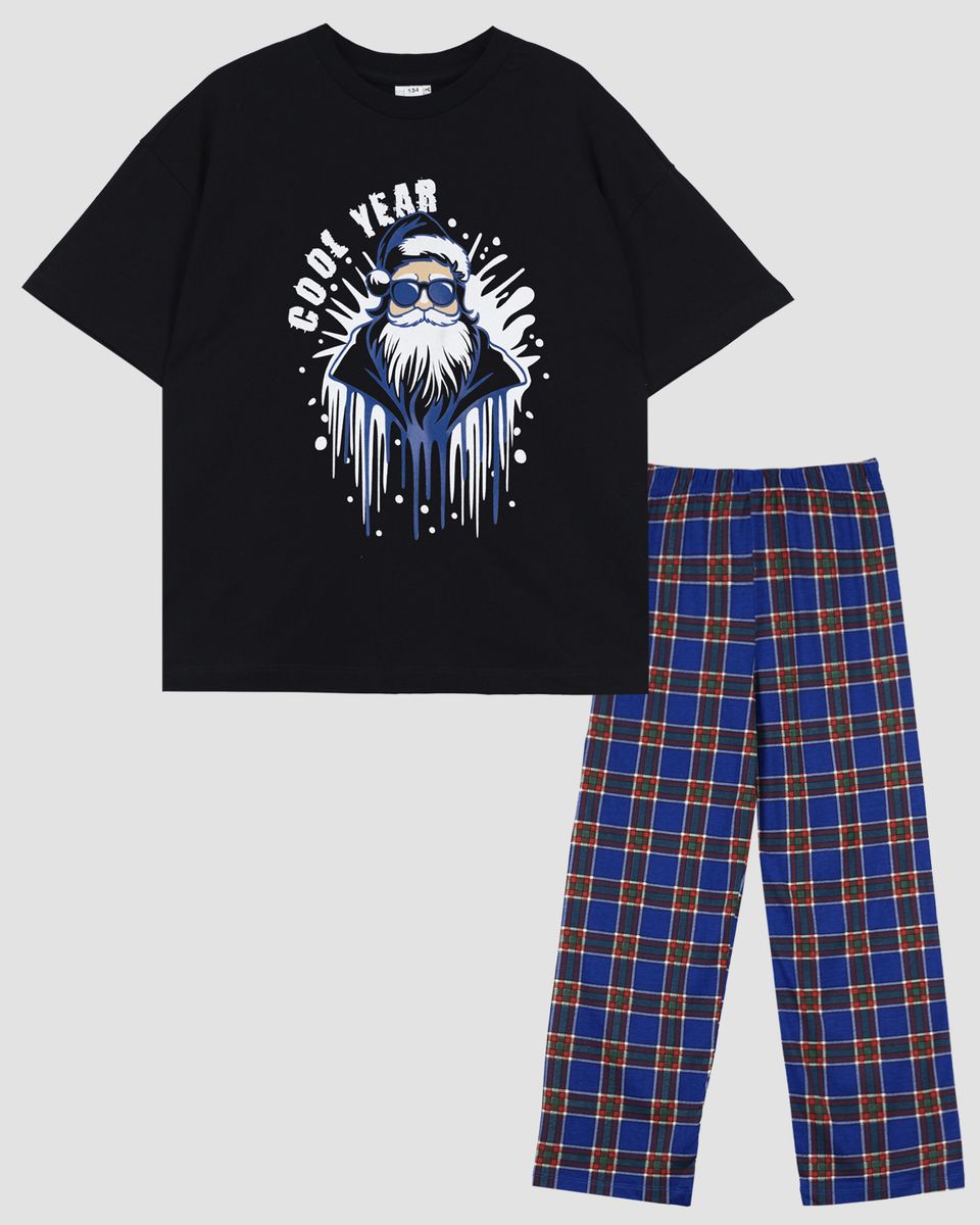 Пижама для мальчика состоит из футболки и брюк. Футболка (оверсайз) свободного силуэта, с коротким рукавом. Горловина круглая, обработана воротником из рибаны. Низ изделия и рукава обработан швом в подгибку. На полочке ПРИНТ ШЕЛКОГРАФИЯ. Надпись переводится как "Классный год". Брюки для мальчика прямого силуэта, из набивного полотна. Пояс цельнокроенный, с эластичной тесьмой внутри.Низ изделия обработан швом в подгибку.