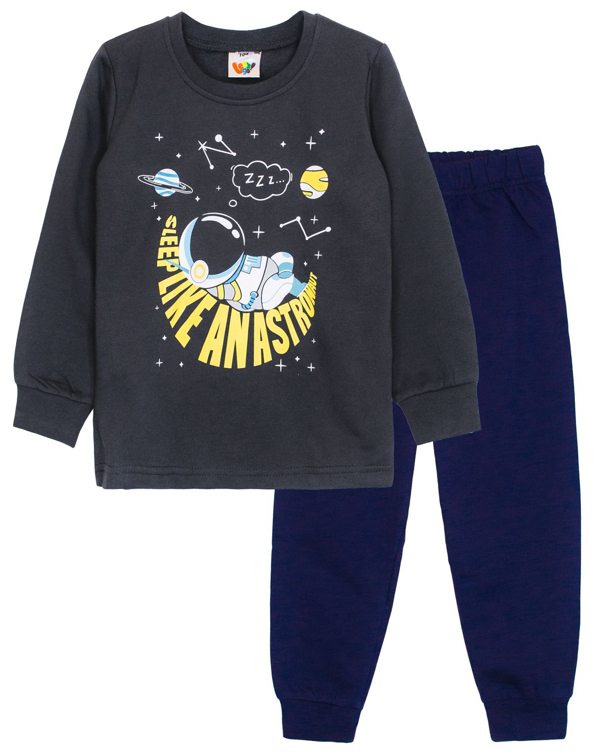 Пижама для мальчика, состоящая из джемпера и брюк. Джемпер прямого силуэта с втачным длинным рукавом. Горловина круглая, окантована рибаной. По низу рукавов манжеты из рибаны. Низ изделия обработан швом в подгибку. На полочке принт шелкография. Брюки прямого покроя, из однотонного полотна. Пояс цельнокроенный, с эластичной тесьмой внутри. По низу изделия манжеты из рибаны.