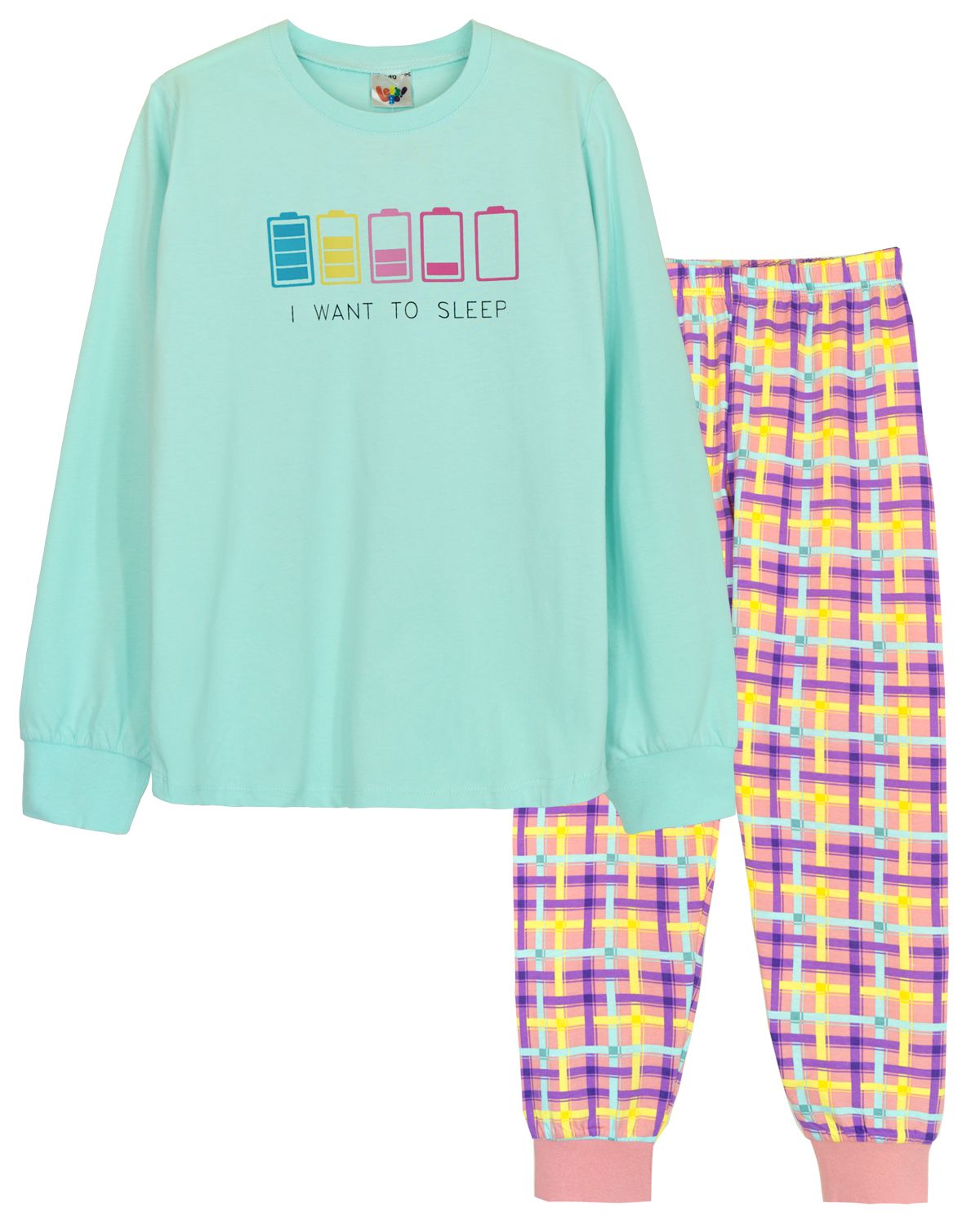 Пижама для девочки, состоящая из джемпера и брюк. Джемпер прямого силуэта, с втачным длинным рукавом. Горловина круглая обработана воротником из рибаны. По низу рукавов манжеты из рибаны. Низ изделия обработан швом в подгибку. На полочке принт шелкография. Брюки прямого покроя, из набивного полотна. Пояс цельнокроенный, с эластичной тесьмой внутри. По низу изделия манжеты из рибаны.