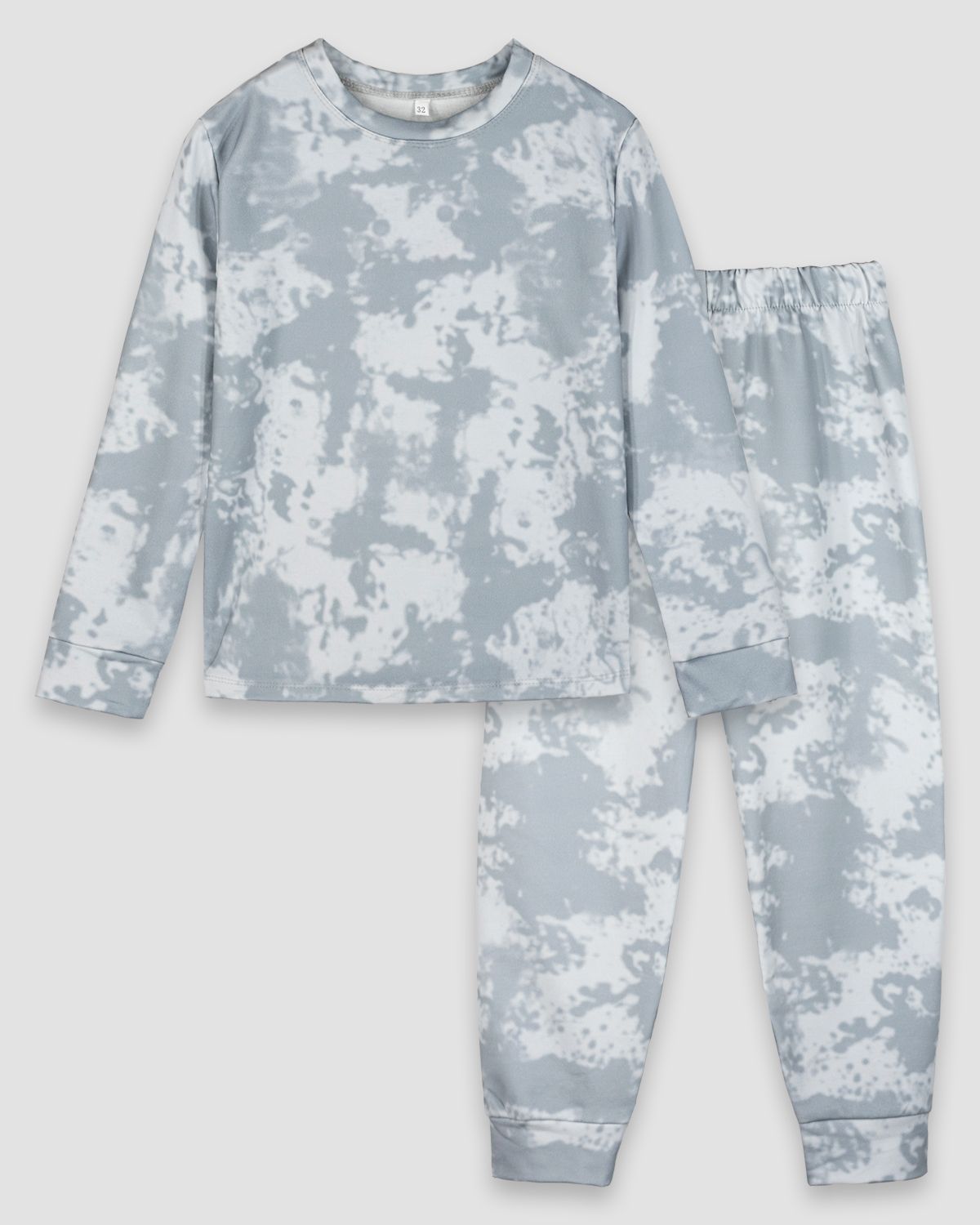 Пижама детская из набивного полотна, состоящая из джемпера и брюк. Джемпер прямого силуэта с втачным длинным рукавом. Горловина круглая обработана воротником из основного полотна. По низу рукавов манжеты из основного полотна. Низ изделия обработан швом в подгибку. Брюки прямого покроя. Пояс цельнокроеный, с эластичной тесьмой внутри. По низу изделия манжеты из основного полотна.