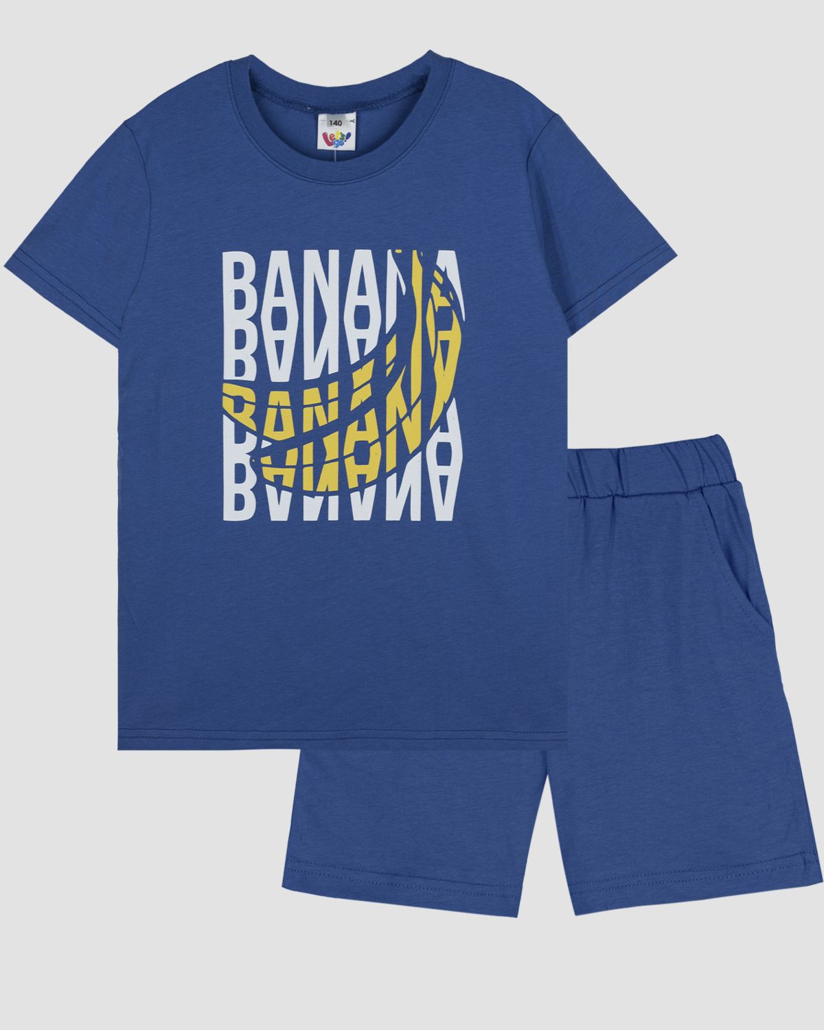 Пижама для мальчика, состоящая из футболки и шорт. Футболка прямого силуэта с втачным коротким рукавом. Горловина круглая, обработана воротником из рибаны. По горловине полочки и спинки отделочная строчка. Низ изделия и рукава обработан швом вподгибку. На полочке принт ШЕЛКОГРАФИЯ. Надпись переводится как "Банан". Шорты для мальчика прямого силуэта из однотонного полотна. Пояс отрезной в цвет изделия, выполнен из основного полотна, с эластичной тесьмой внутри. На передних половинках шорт выполнены карманы с отрезным бочком. Низ изделия обработан швом в подгибку.