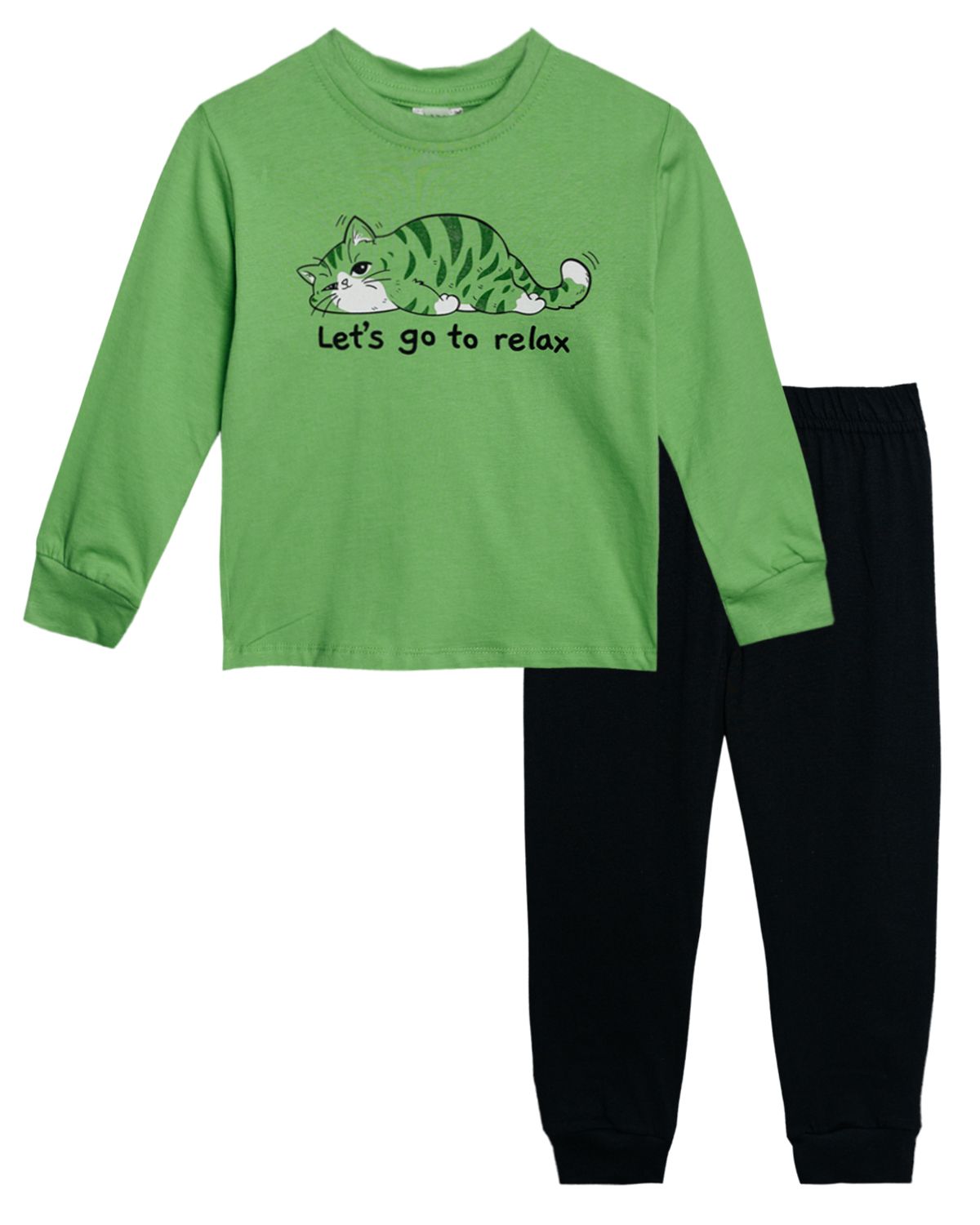 Пижама для мальчика, состоящая из джемпера и брюк. Джемпер прямого силуэта, с втачным длинным рукавом. Горловина круглая обработана обтачкой из рибаны. По низу рукавов манжеты из рибаны. Низ изделия обработан швом вподгибку. На полочке принт Шелкография. Надпись переводится как "Вперед отдыхать". Брюки прямого силуэта, из однотонного полотна. Пояс цельнокроенный, с эластичной тесьмой внутри. По низу изделия манжеты из рибаны.