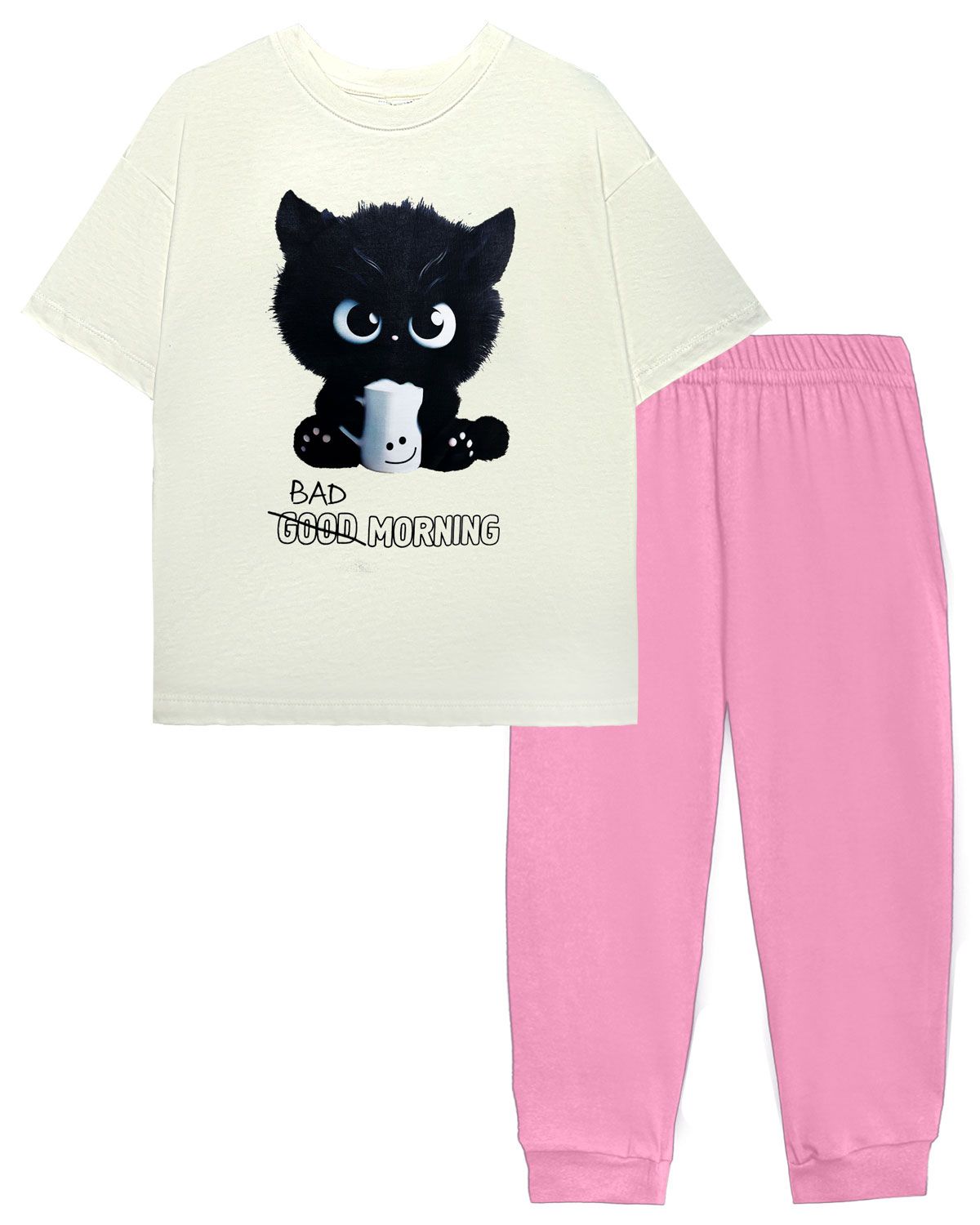 Пижама для девочки, состоящая из футболки и брюк. Футболка свободного силуэта (оверсайз), с коротким рукавом. Горловина круглая обработана обтачкой из рибаны. Низ изделия и рукава обработан швом вподгибку. На полочке Фотопринт. Надпись переводится как "Хорошее/Плохое утро". Брюки прямого силуэта, из однотонного полотна. Пояс цельнокроенный, с эластичной тесьмой внутри. По низу изделия манжеты из рибаны.