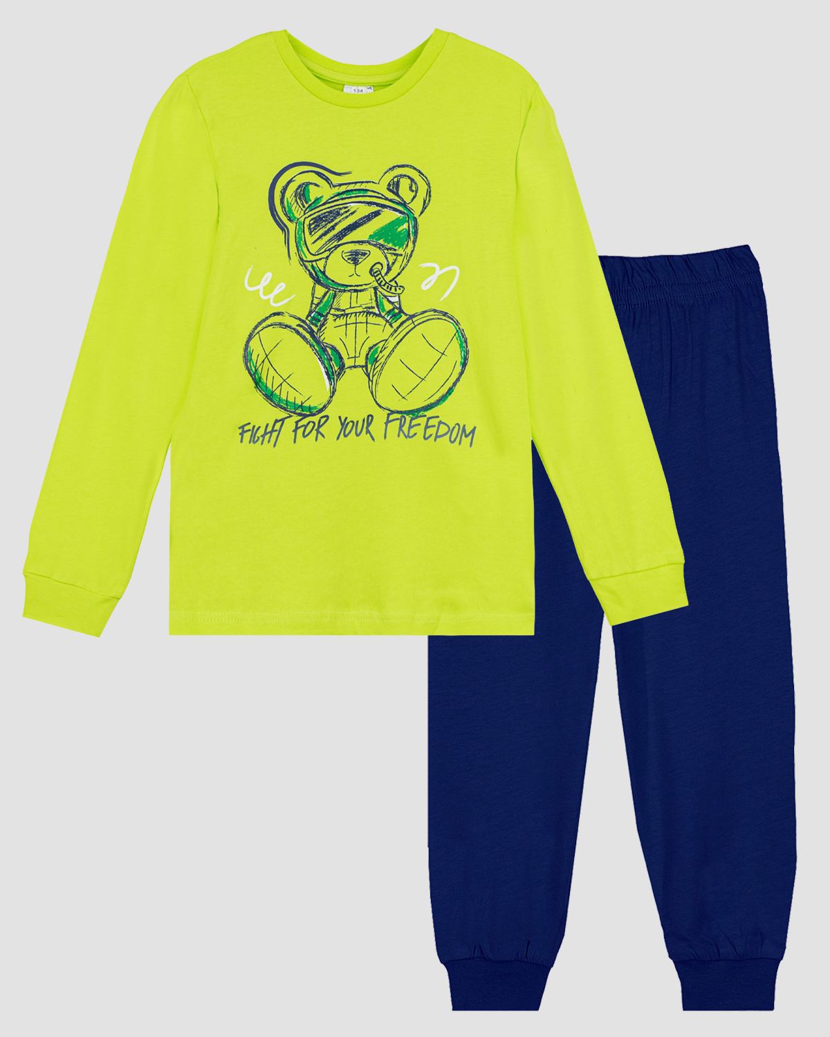 Пижама детская, состоящая из джемпера и брюк. Джемпер прямого силуэта, с втачным длинным рукавом. Горловина круглая обработана воротником из рибаны. По низу рукавов манжеты из рибаны. Низ изделия обработан швом в подгибку. На полочке принт шелкография с флуоресцентной краской. Надпись переводится как "Борись за свою свободу". Брюки прямого покроя, из набивного полотна. Пояс цельнокроенный, с эластичной тесьмой внутри. По низу изделия манжеты из рибаны.
