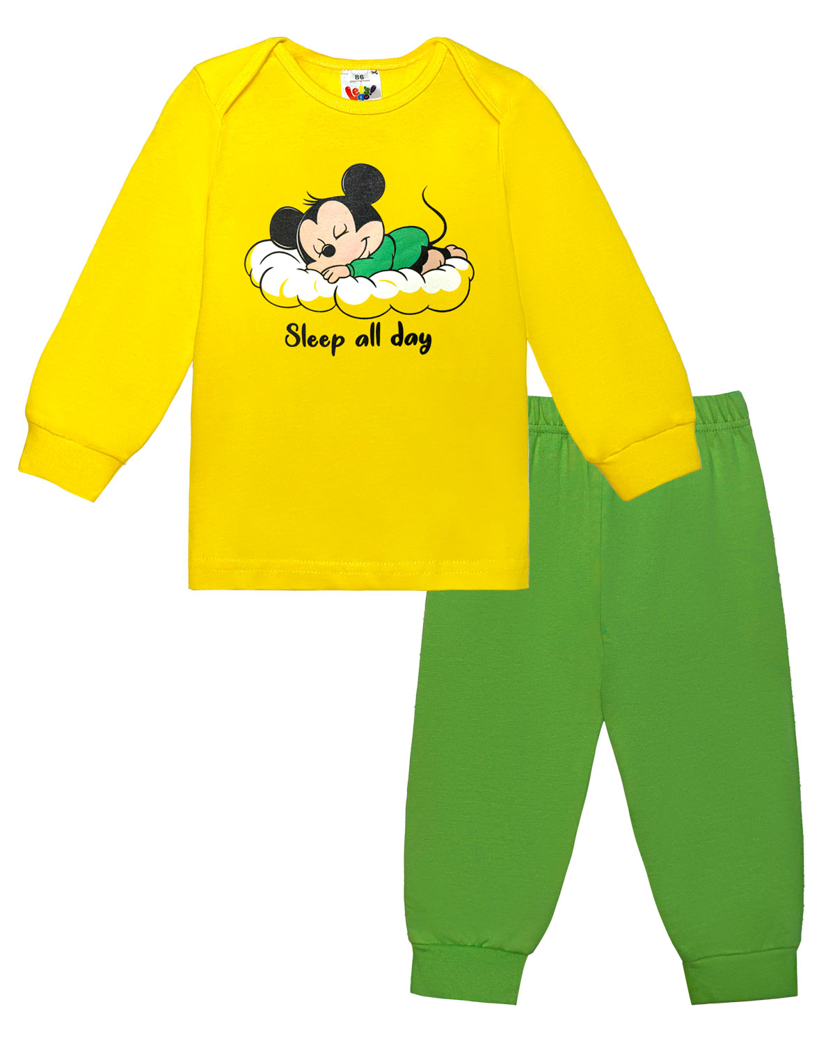 Пижама детская, состоящая из джемпера и брюк. Джемпер прямого силуэта, с втачным длинным рукавом. Горловина круглая, обработана бейкой из рибаны. Спинка, в плечевых швах, переходит на полочку с нахлестом 5см, образуя фигурное закругление к точке основания шеи, по край обработан бейкой из рибаны. По низу рукавов манжеты из рибаны. Низ изделия обработан швом вподгибку. На полочке принт Шелкография. Надпись переводится как "Спать весь день". Брюки прямого силуэта, из однотонного полотна. Пояс цельнокроенный, с эластичной тесьмой внутри. По низу изделия манжеты из рибаны.
