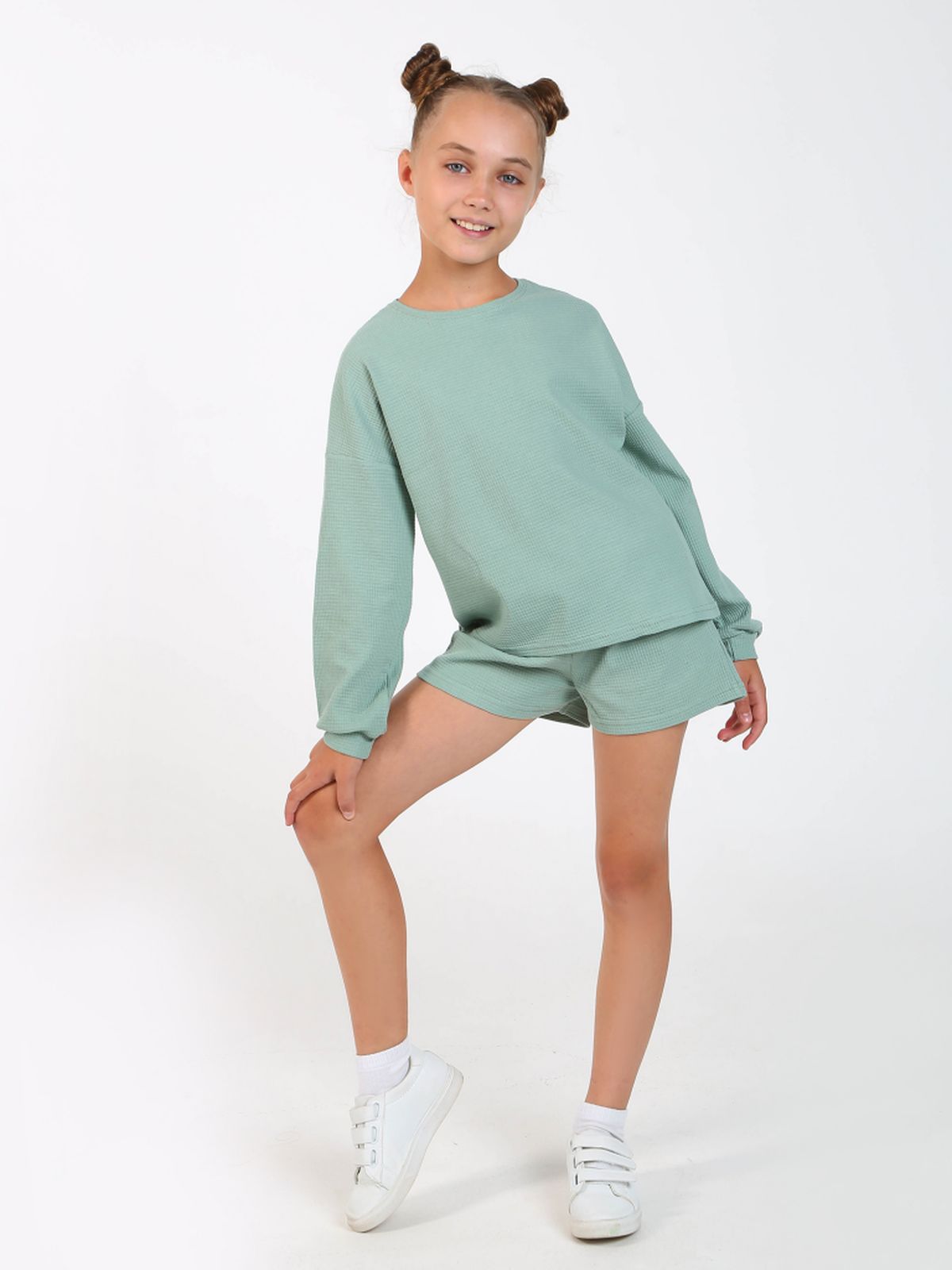 Комплект одежды для девочки бренда "Ивашка" оптом. Костюм из мягкого вафельного трикотажа. Свитшот свободного кроя, круглый вырез горловины, спущенные рукава с манжетами. Свободные шорты с имитацией гульфика.