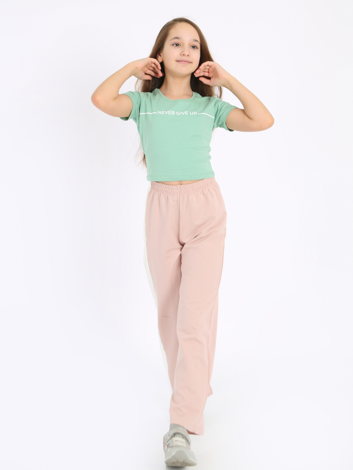 Комплект одежды для девочки бренда "Ивашка" оптом. Костюм из двух видов ткани. Укороченная футболка прилегающего силуэта из хлопка с добавлением лайкры. Рукав втачной, короткий. Горловина отделана узкой обтачкой, полочка украшена шелкографией. Брюки просторные с высокой посадкой, на широком поясе с боковой вставкой. Выполнены из прочной ткани с добавлением эластана.