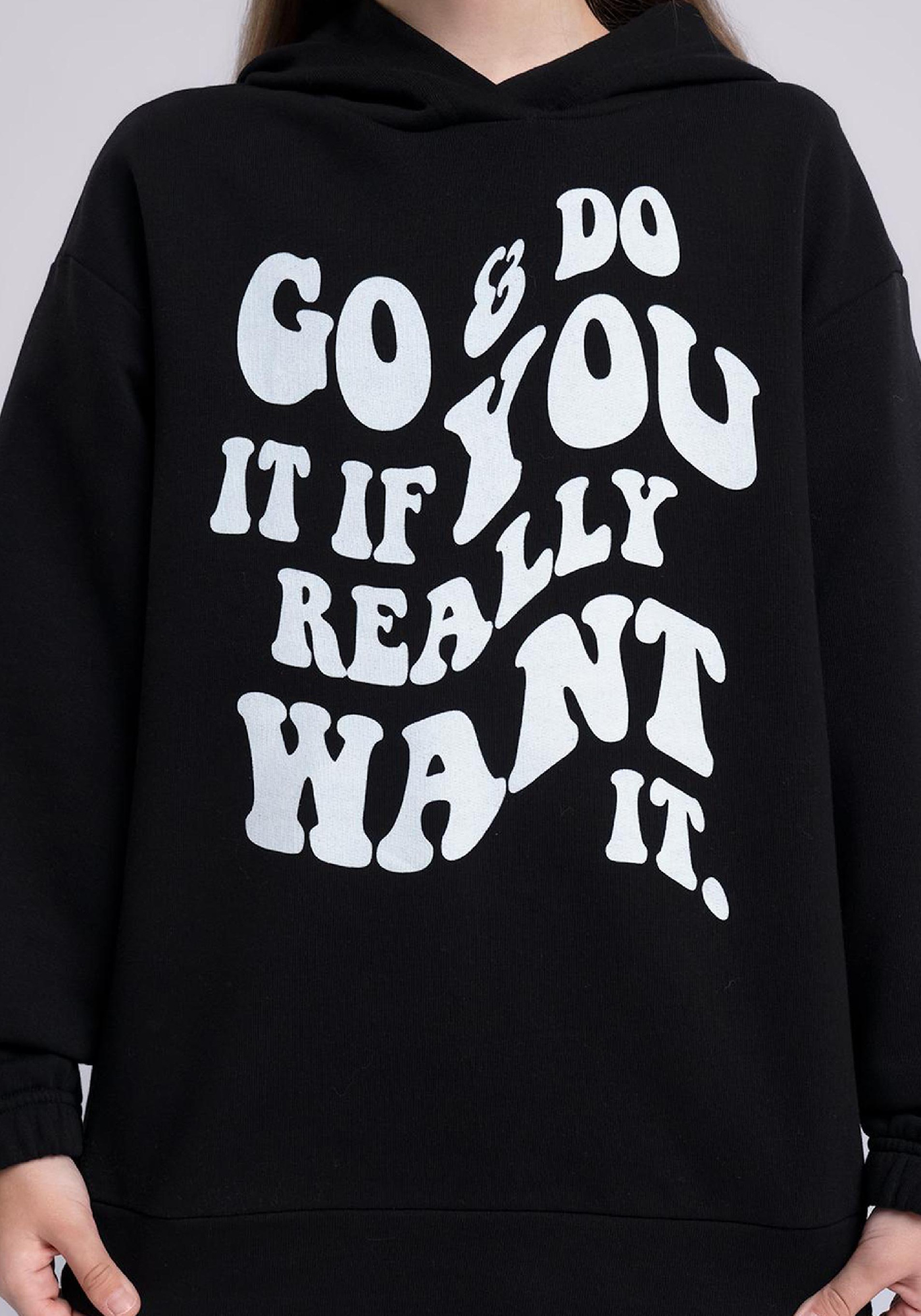 Худи среднего объёма с капюшоном из футера 3х нитка петля. По низу рукава резинка. Впереди принт.