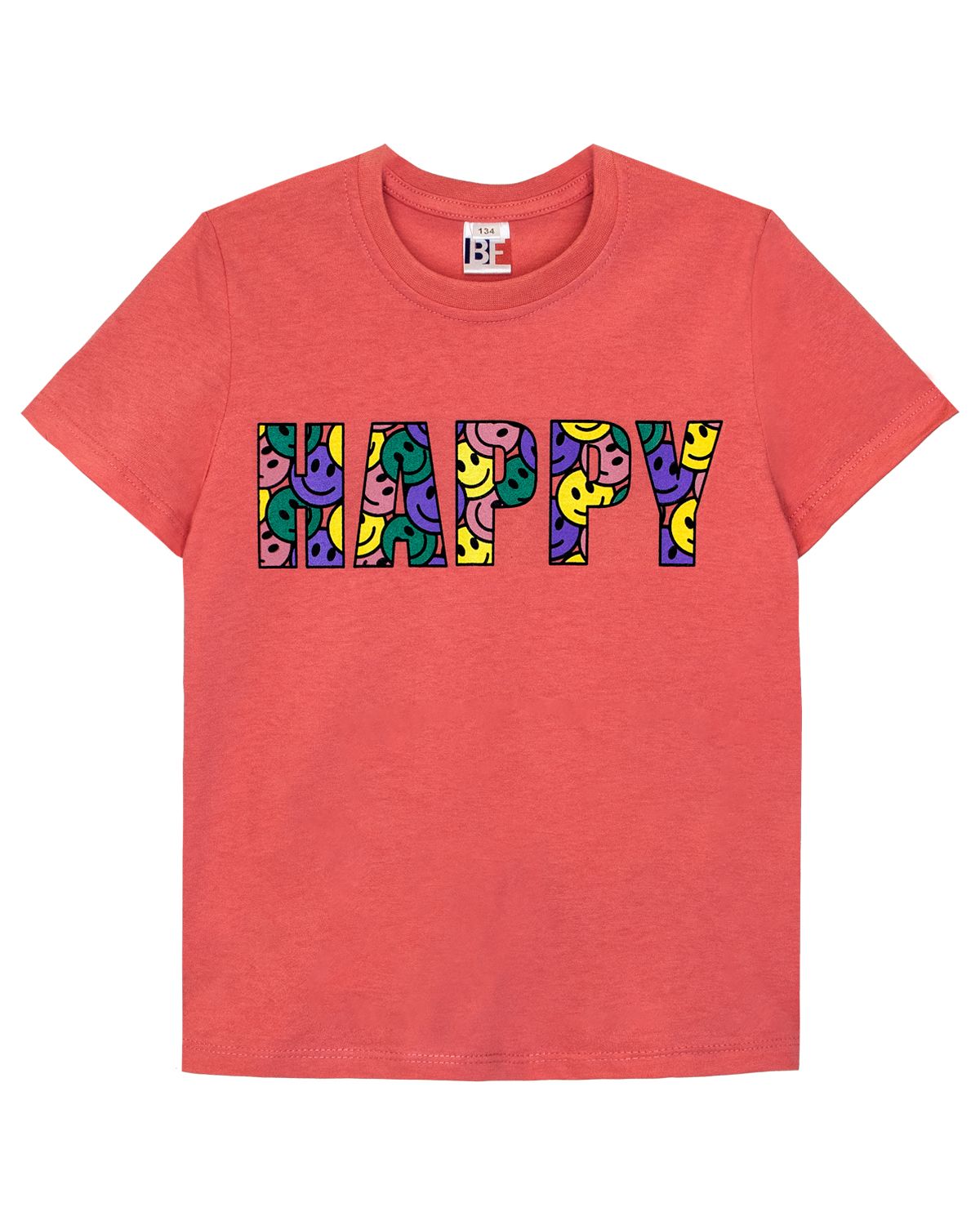 Футболка для девочки прямого силуэта с втачным коротким рукавом. Горловина круглая обработана воротником из рибаны. Горловина по полочке и спинке отстрочена нитками в цвет изделия. Низ изделия и рукавов обработан швом в подгибку. На полочке принт шелкография. Надпись переводится как "Счастливая".