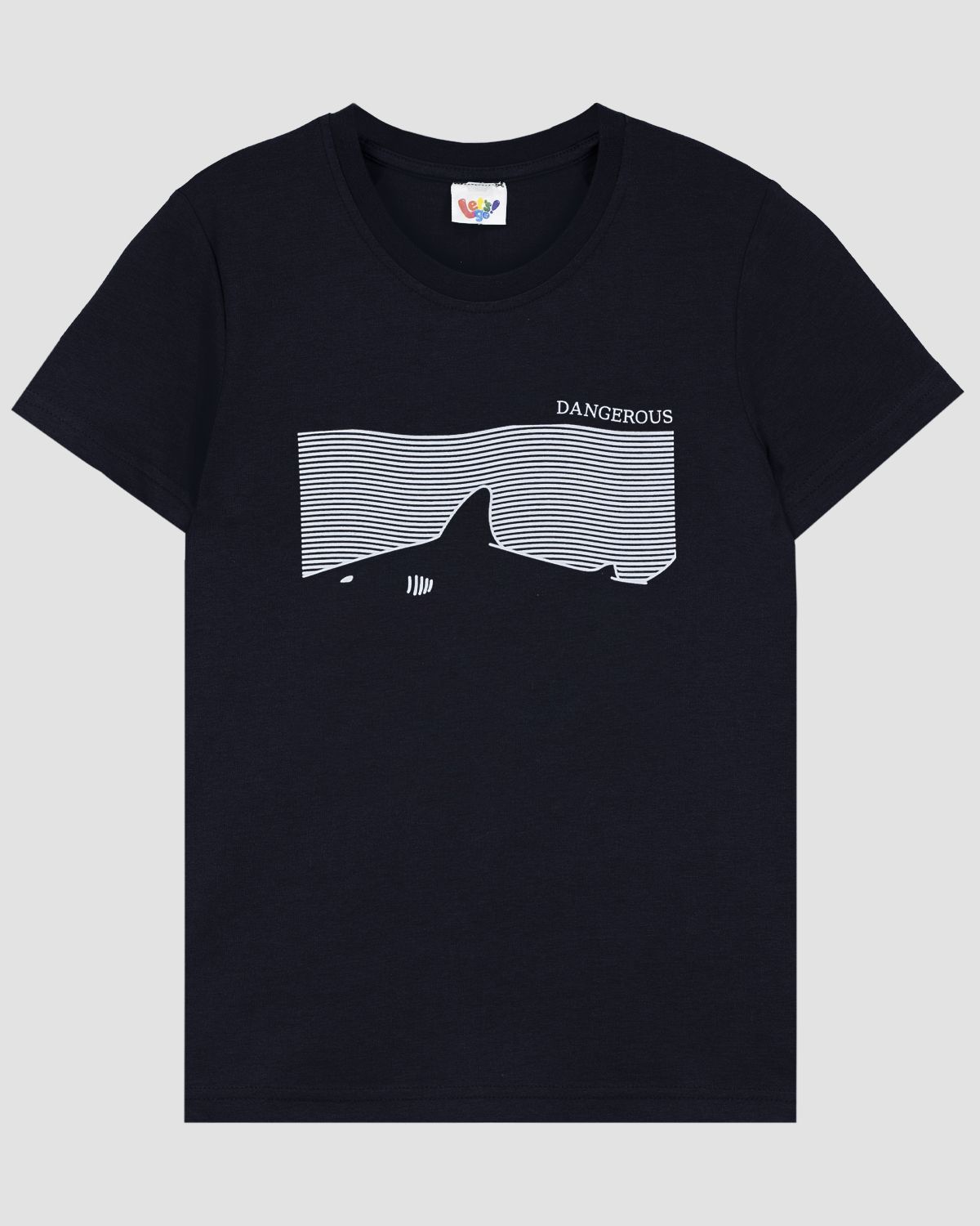 Футболка детская прямого силуэта с втачным коротким рукавом. Горловина круглая, обработана воротником из рибаны . Горловина спинки внутри укреплена бейкой из кулирки. Низ изделия и рукава обработан швом вподгибку. На полочке принт ШЕЛКОГРАФИЯ. Надпись переводится как "Опасный".