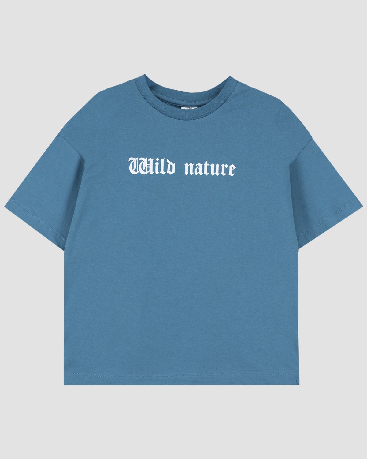 Футболка для мальчика прямого силуэта, со спущенным плечом коротким рукавом. Горловина круглая, обработана воротником из рибаны. Горловина спинки внутри укреплена бейкой из кулирки. По горловине полочки отделочная строчка. Низ изделия и рукавов обработан швом в подгибку. На полочке принт ШЕЛКОГРАФИЯ. Надпись переводится как "Дикая природа".
