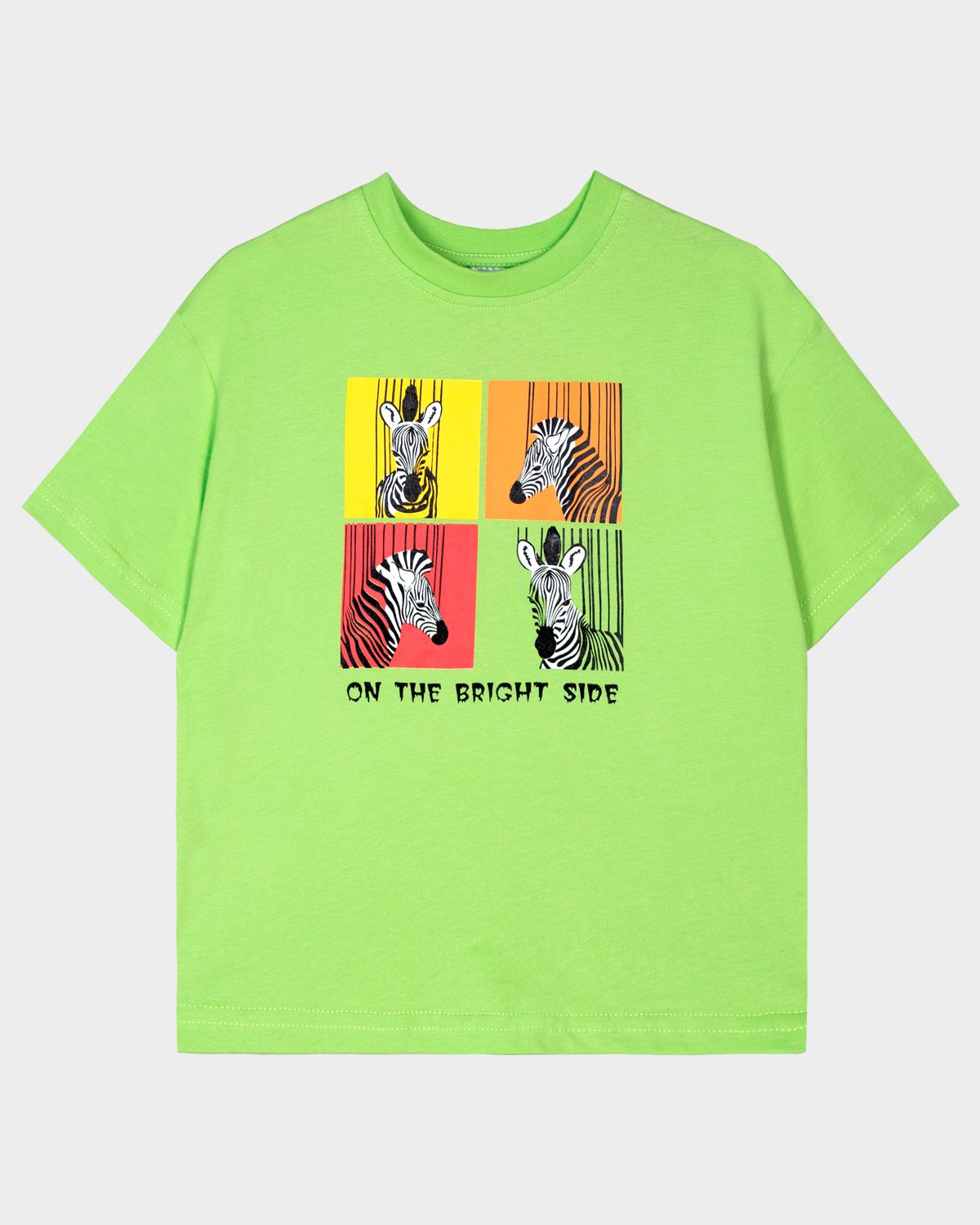 Футболка для мальчика свободного силуэта (оверсайз) с коротким рукавом. Горловина круглая, обработана обтачкой горловиной из рибаны. Низ изделия и рукава обработаны швом вподгибку. На полочке принт Шелкография. Надпись переводится как "На светлой стороне".