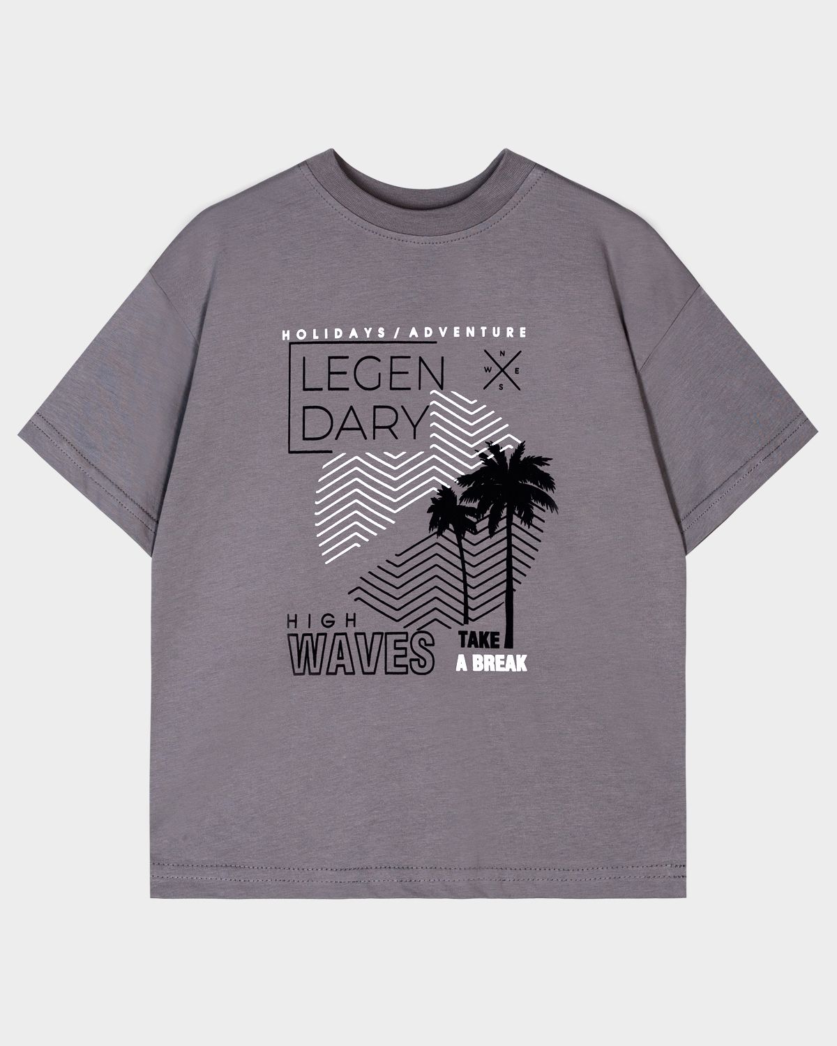 Футболка для мальчика свободного силуэта (оверсайз) с коротким рукавом. Горловина круглая, обработана обтачкой горловиной из рибаны. Низ изделия и рукава обработаны швом вподгибку. На полочке принт Шелкография. Надпись переводится как "Праздники, приключения;Легендарный день;Высокие волны;Сделайте перерыв".