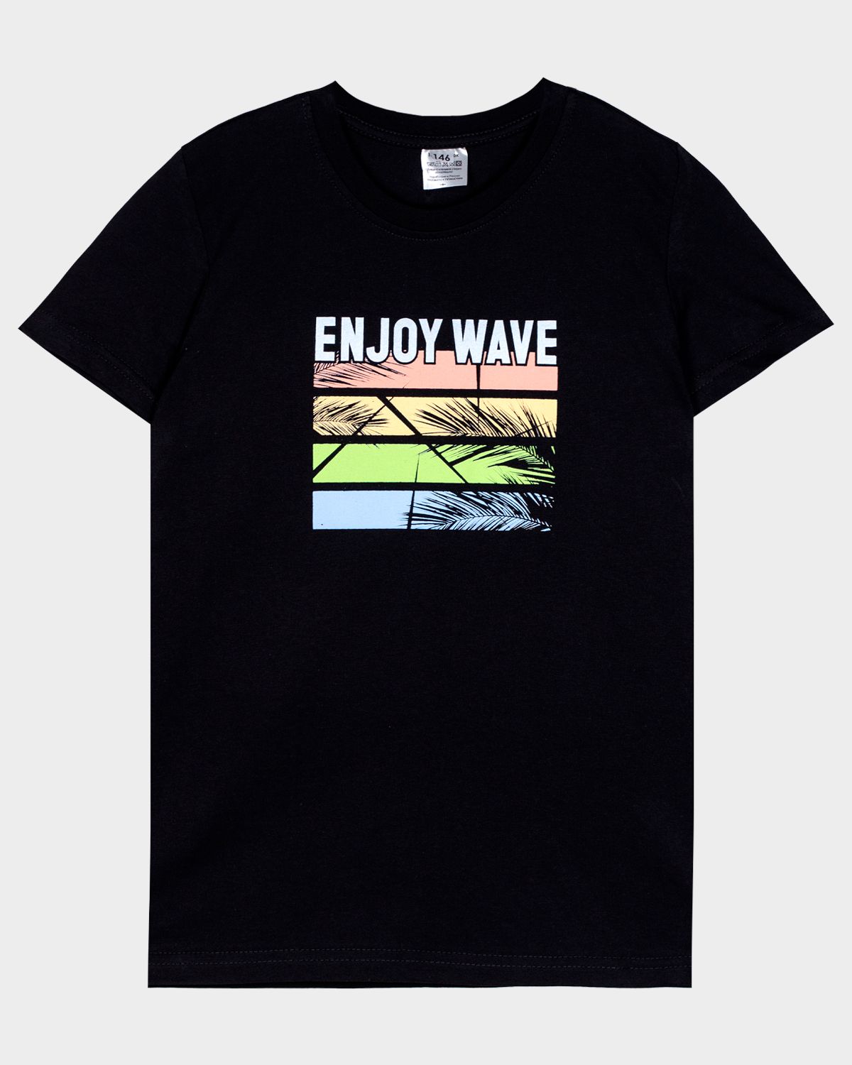 Футболка для мальчика прямого силуэта, с втачным коротким рукавом. Горловина круглая, обработана обтачкой из рибаны. Низ изделия и рукава обработан швом вподгибку. На полочке принт Шелкография. Надпись переводится как "Наслаждайся волной".
