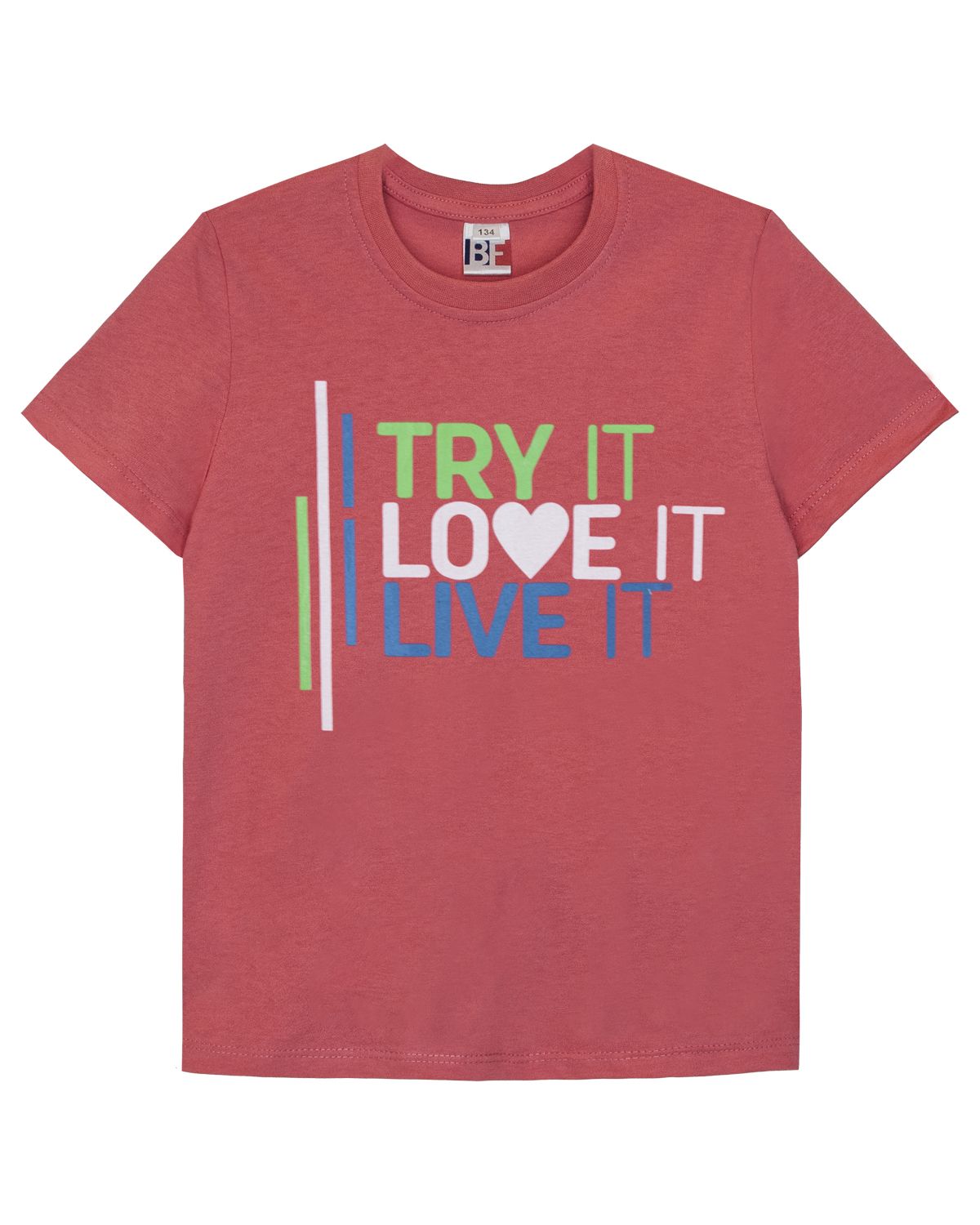 Футболка для девочки прямого силуэта с втачным коротким рукавом. Горловина круглая обработана воротником из рибаны. Горловина по полочке и спинке отстрочена нитками в цвет изделия. Низ изделия и рукавов обработан швом в подгибку. На полочке принт шелкография. Надпись переводится как "Пробуй; Люби; Живи".