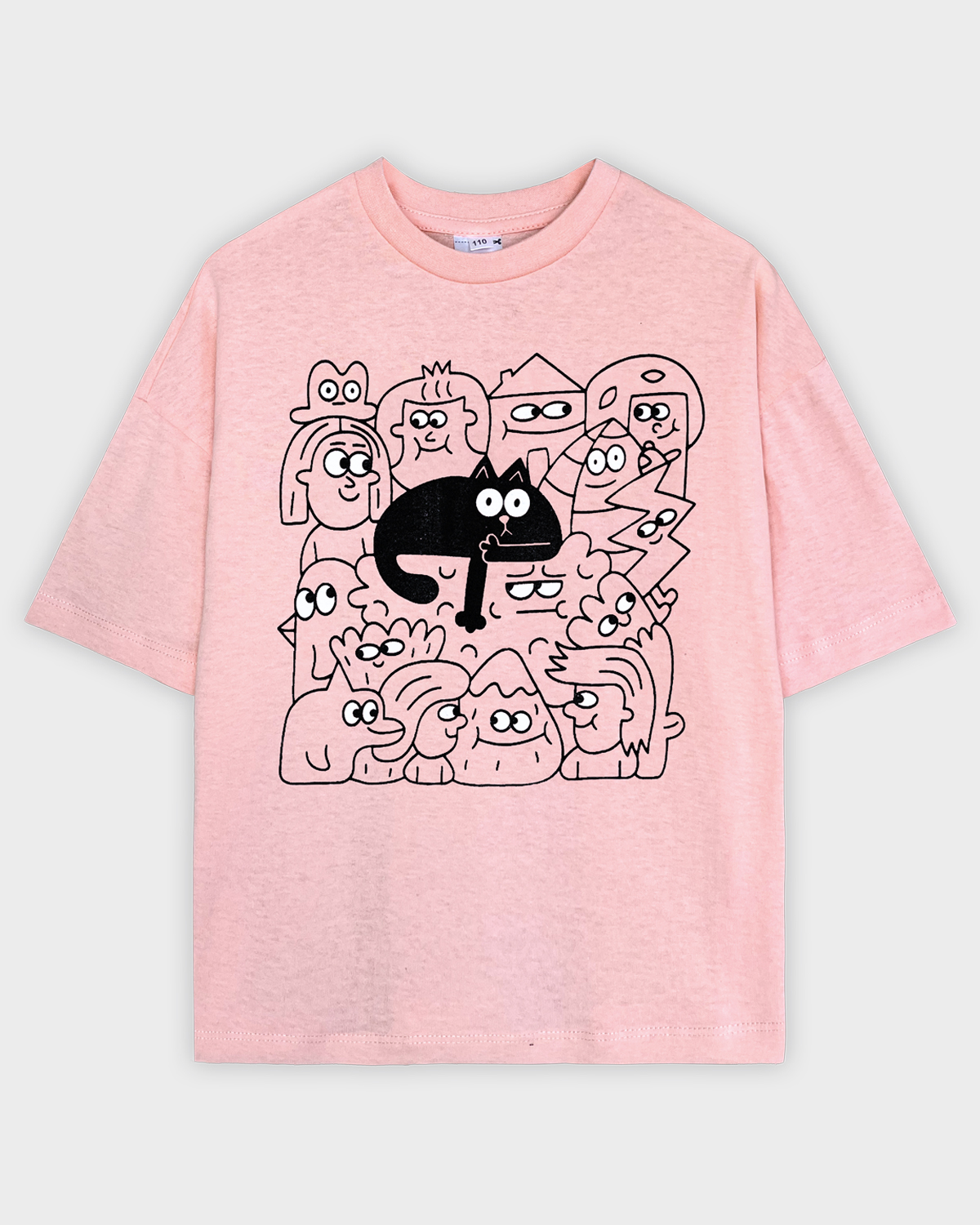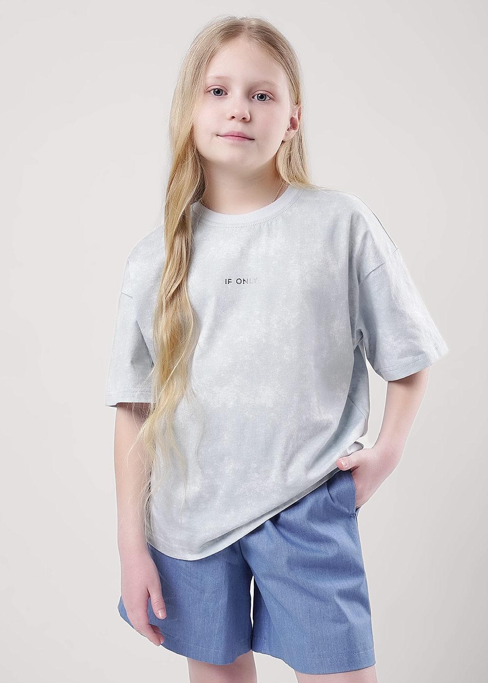 Футболка детская свободного силуэта (оверсайз) с коротким рукавом. Горловина круглая, обработана обтачкой горловиной из рибаны. Низ изделия и рукава обработаны швом вподгибку. На полочке и спинке принт Шелкография.