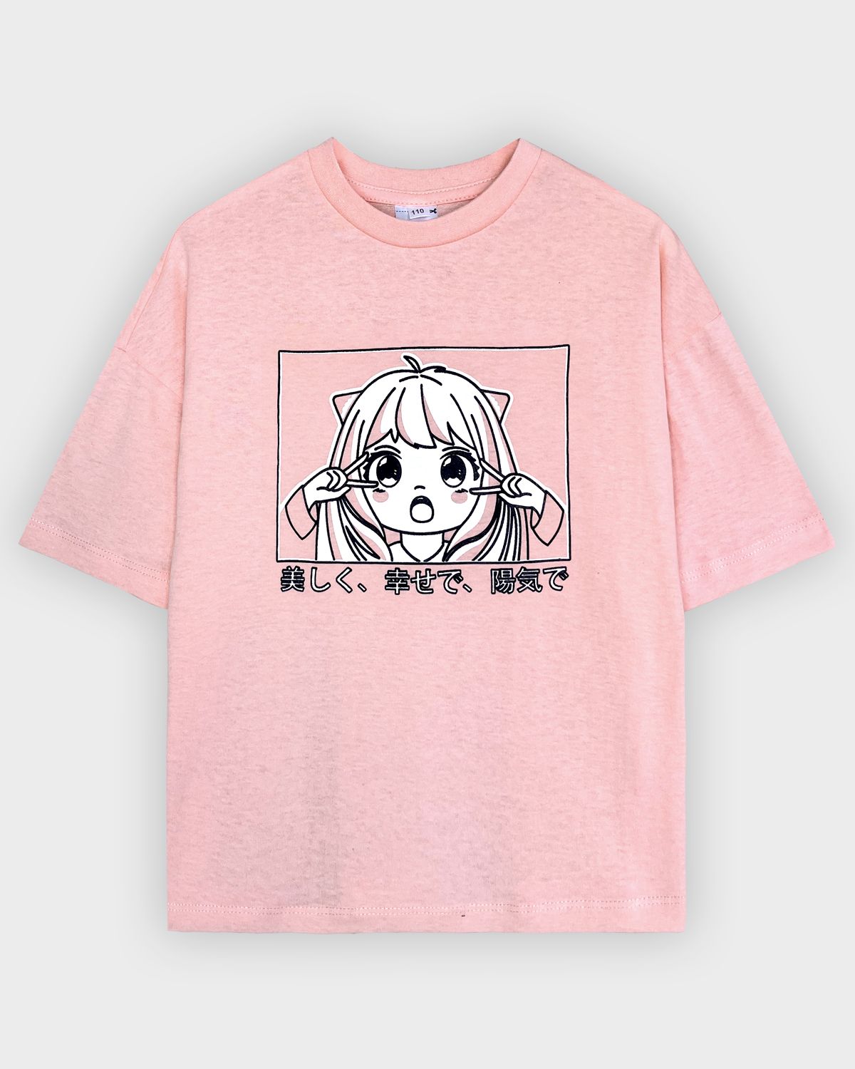 Футболка для девочки свободного силуэта (оверсайз) с коротким рукавом. Горловина круглая, обработана обтачкой из рибаны. Низ изделия и рукава обработаны швом вподгибку. На полочке принт Шелкография. Надпись переводится как "Красивая, счастливая и веселая".