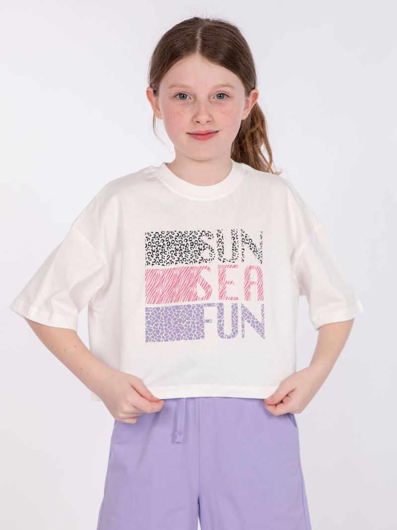 Футболка для девочки свободного силуэта (оверсайз) укороченная с коротким рукавом. Горловина круглая, обработана обтачкой из рибаны. Низ изделия и рукавов обработаны швом вподгибку. На полочке принт Шелкография. Надпись переводится как "Солнце, море, веселье".