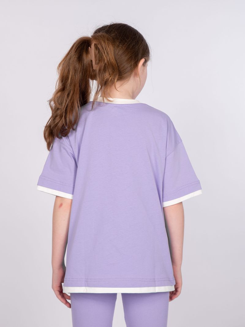 Футболка для девочки свободного силуэта (оверсайз) с коротким рукавом. Горловина круглая, обработана обтачкой из рибаны. Низ изделия и рукава обработаны швом вподгибку. На полочке принт Шелкография.