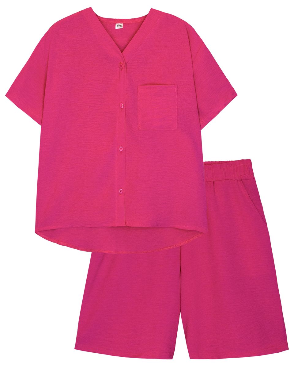 Комплект для девочки. Рубашка для девочки, прямого силуэта, умеренного обьема, центральная застежка на пуговицах, втачная стойка, плечо удлинено, рубашечный короткий рукав,спинка цельная удлинена , на левой полочке расположен квадратный накладной карман, низ изделия фигурный. Шорты для девочки, удлиненные, прямого силуэта. Отрезной пояс, из основного полотна, с эластичной тесьмой внутри. На передней половинке шорт карманы с отрезным бочком. Низ изделия обработан швом в подгибку.