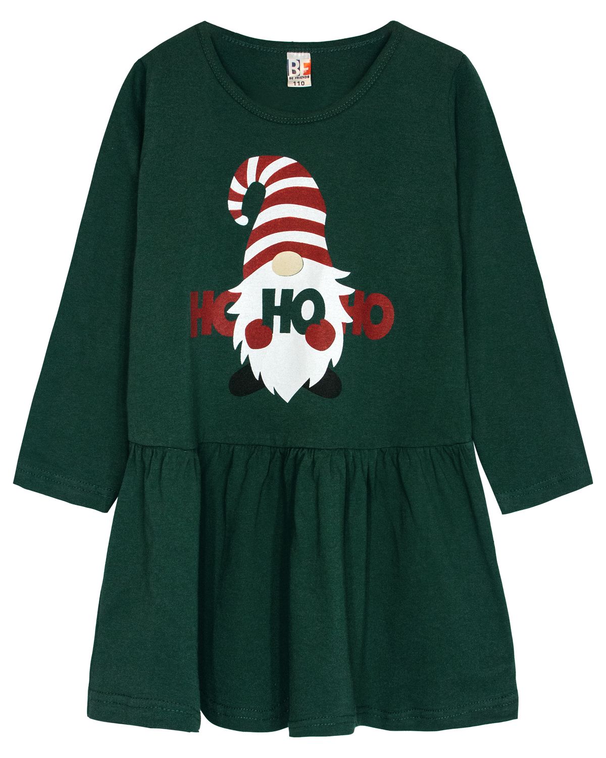 Платье А-силуэта для девочки из гладкокрашенной кулирки. На полочке принт (шелкография). Платье умеренного объема, с воланом со сборкой по низу. У платья длинный втачной рукав. Округлый вырез горловины обработан бейкой из основного полотна.