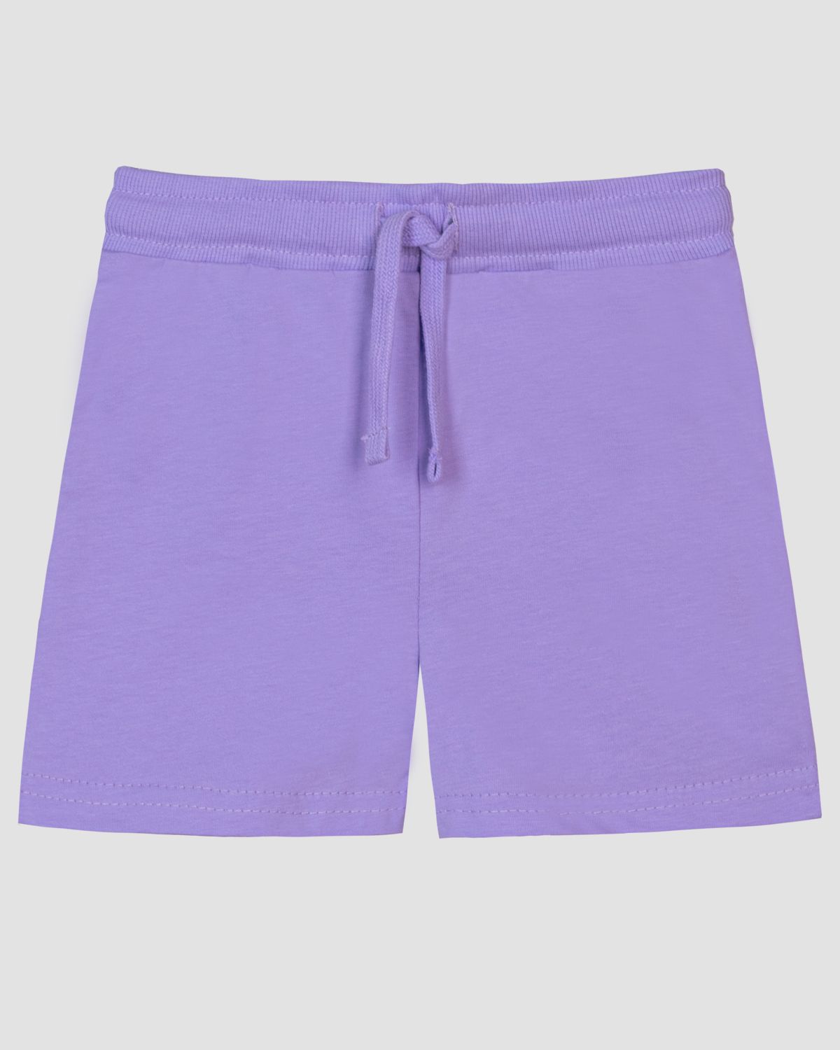 Шорты для девочки прямого силуэта из кулирки. Пояс отрезной в цвет изделия, выполнен из кашкорсе. По поясу шорт вставлен плоский утягивающий шнурок в цвет изделия, шнурок закреплен отстрочкой вдоль пояса. Низ изделия обработан швом вподгибку.