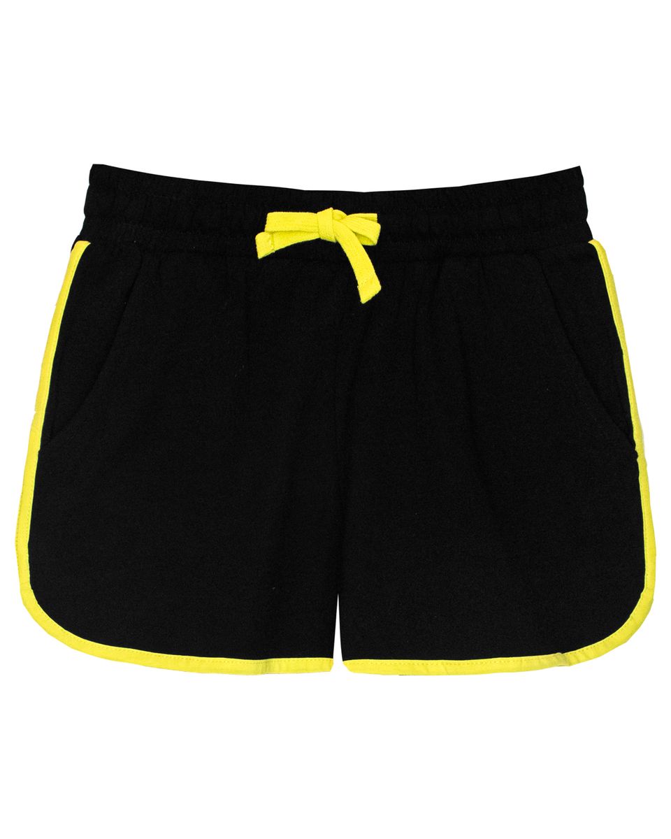 Шорты для девочки прямого силуэта из однотонного полотна. Пояс отрезной в цвет изделия, выполнен из основного полотна, с эластичной тесьмой внутри. По поясу шорт вставлен плоский утягивающий шнурок. На передних половинках шорт выполнены карманы с отрезным бочком. Боковой шов и низ изделия обработаны бейкой контрастного цвета.
