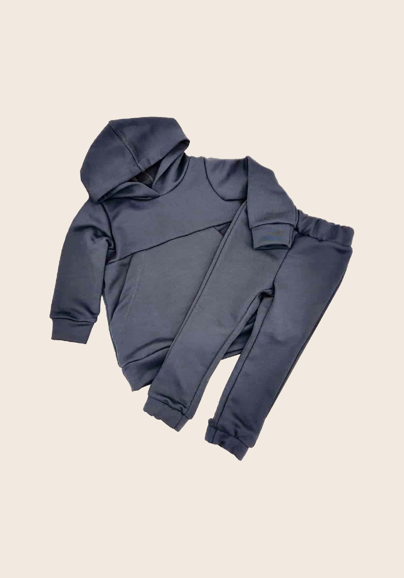 Костюм из толстой ткани с начесом 2х расцветок. Толстовка свободного силуэта, удлиненная на поясе и с капюшоном. Рукав со спущенным плечом с цельнокроенной манжетой на резинке. Полочка имеет вертикальную вставку из отделочной ткани, Украшенную шелкографией. Капюшон стойка, которая выполнена из ткани такой же расцветки, что и вставка полочки. Брюки свободные, внизу на манжетах с резинкой. Для украшения передние половинки имеют вертикальный разрез. Ткань хорошо пропускает воздух и удерживает тепло.