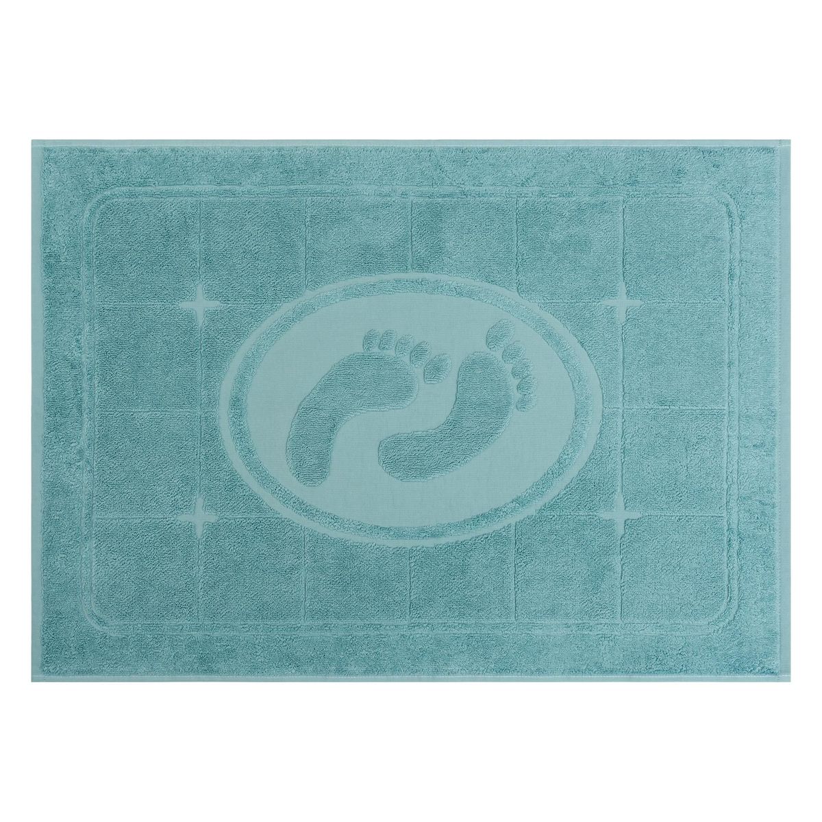 Полотно: махра. Размер: 50х70 Состав: 100% хлопок. Плотность 650 г/м². Дизайн: лаконичный коврик выполнен в стиле ретро с простыми линиями и утрированным рисунком. Одноцветное махровое полотно декорировано рельефной композицией в виде керамической плитки и отпечатков ног.