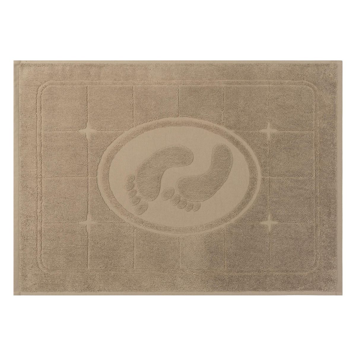 Полотно: махра. Размер: 50х70 Состав: 100% хлопок. Плотность 650 г/м². Дизайн: лаконичный коврик выполнен в стиле ретро с простыми линиями и утрированным рисунком. Одноцветное махровое полотно декорировано рельефной композицией в виде керамической плитки и отпечатков ног.