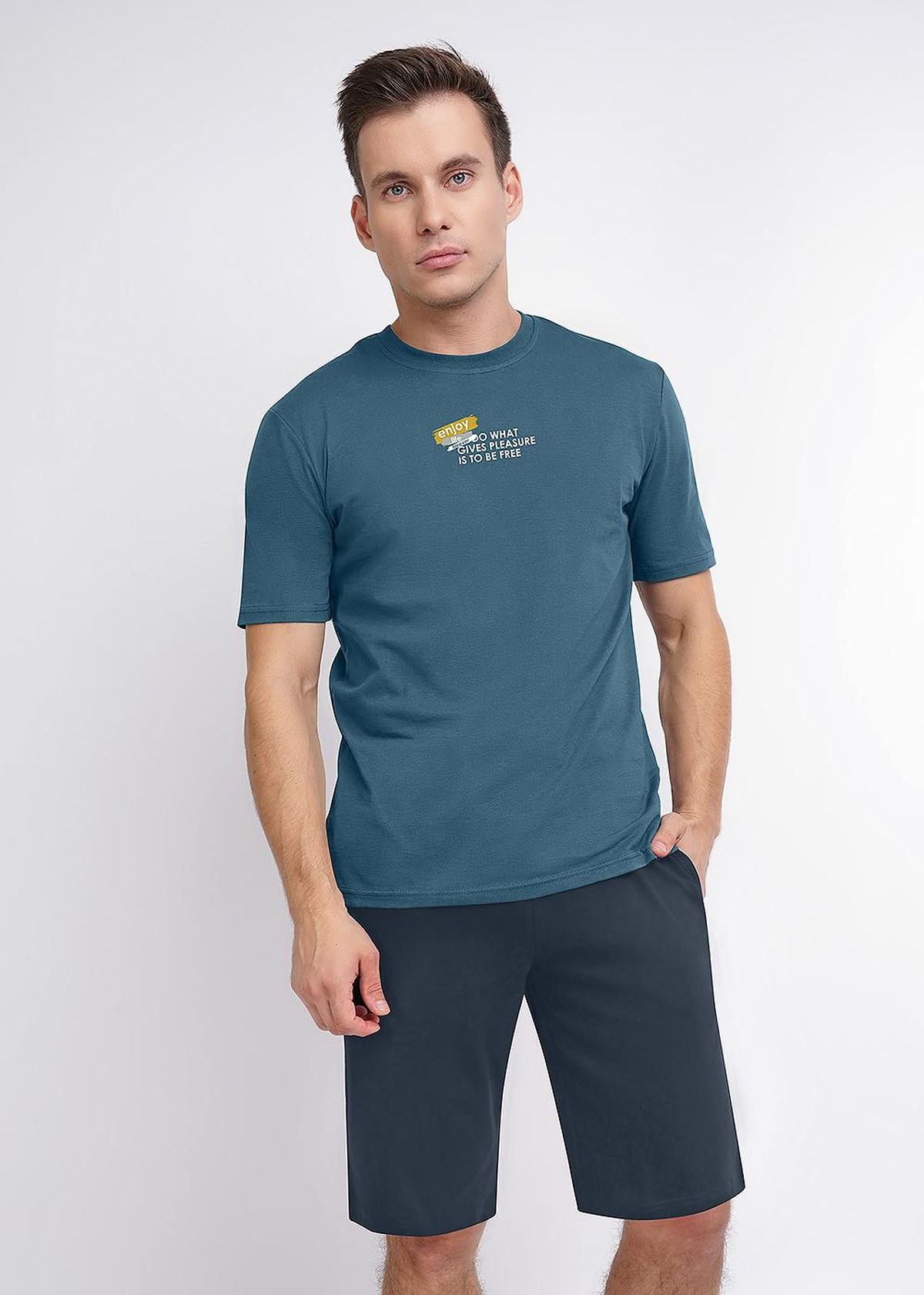 Костюм мужской ,состоящий из футболки и шорт. Футболка - из гладкокрашеного полотна "кулирка", классического покроя, с короткими втачными рукавами, горловиной овальной формы, обработанной втачной планкой, и принтом вцентре переда, выполненным в технике шелкографии. Шорты - из полотна с набивным рисунком, удлиненные, на притачном поясе с эластичнойтесьмой внутри и карманами в боковых швах, входы в которые окантованы основным материалом.