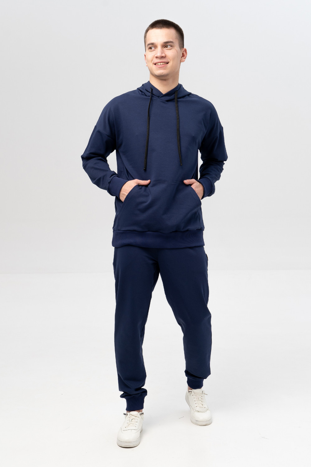 Мужское худи из мягкого хлопкового футера имеет капюшон на регулируемом шнурке, карман «кенгуру» и широкие манжеты и пояс по низу из кашкорсе, благодаря чему модель прекрасно сохраняет тепло тела. Популярный oversize и мягкая изнанка – составляющие городского стиля и повышенного комфорта.