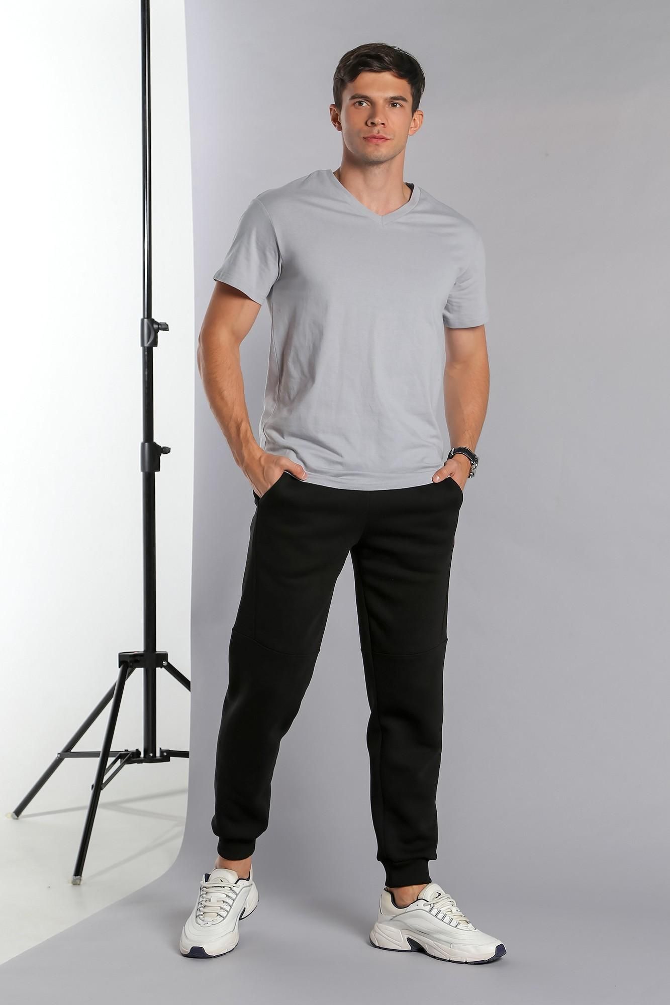 Брюки мужские из футера с начесом. Модель с эффектным членением, с боковыми карманами, на поясе с отстроченной эластичной тесьмой и шнуром.
