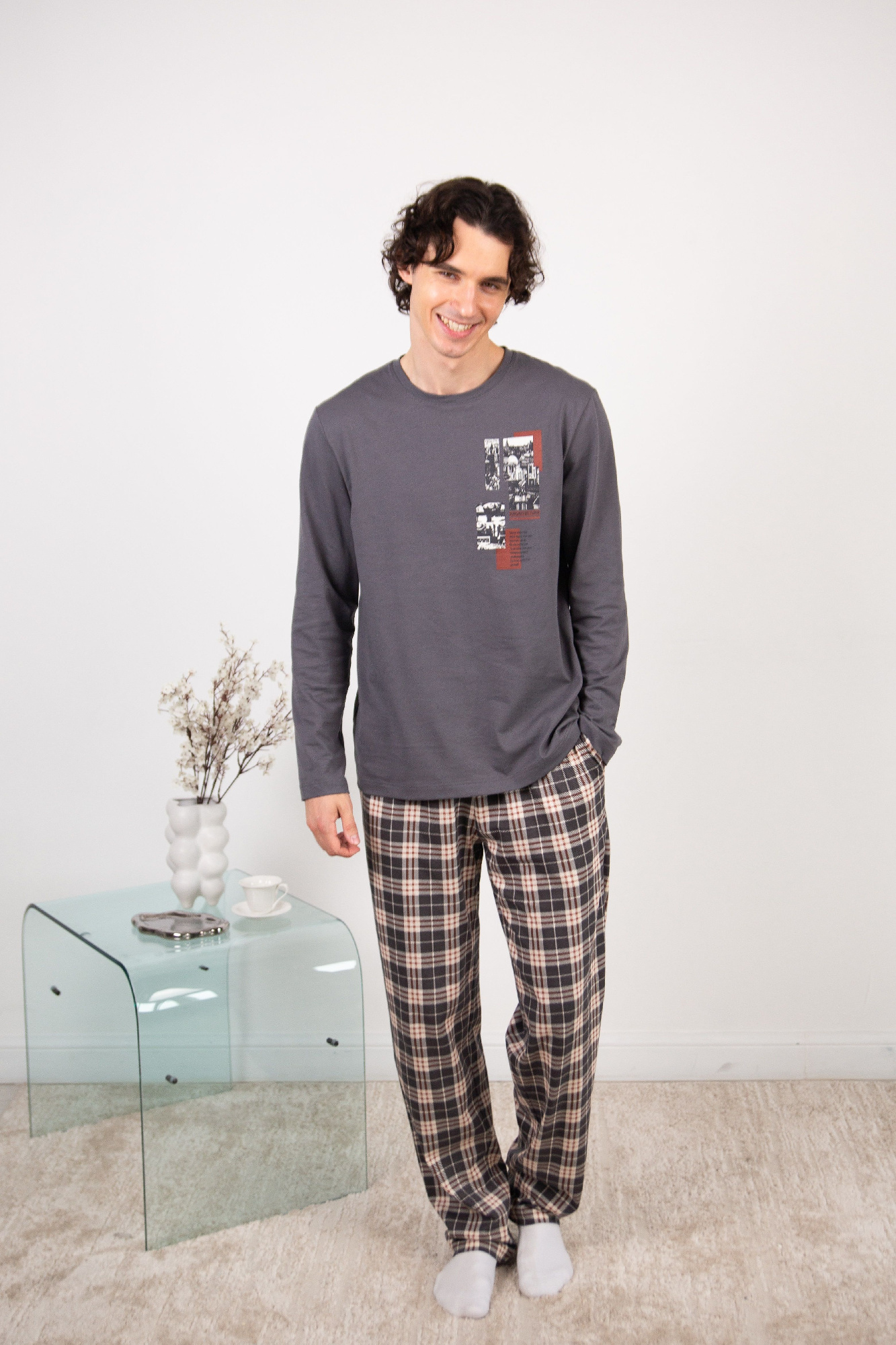 Набор мужской, состоящий из футболки и брюк. Футболка из хлопковой кулирной глади с коротким рукавом , спереди авторский принт. Брюки из набивной кулирной глади на широком поясе с резинкой и шнуром, по бокам удобные карманы.