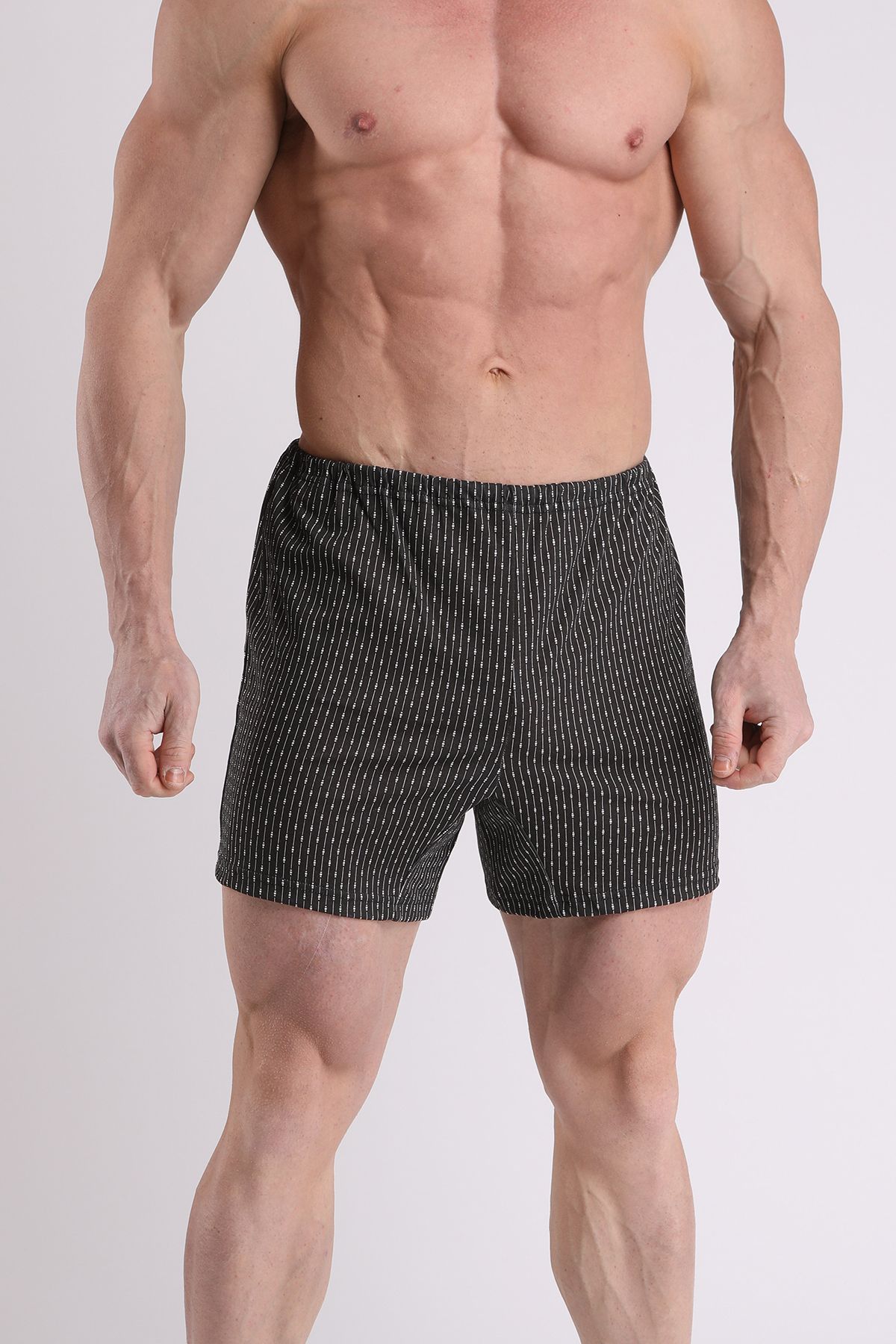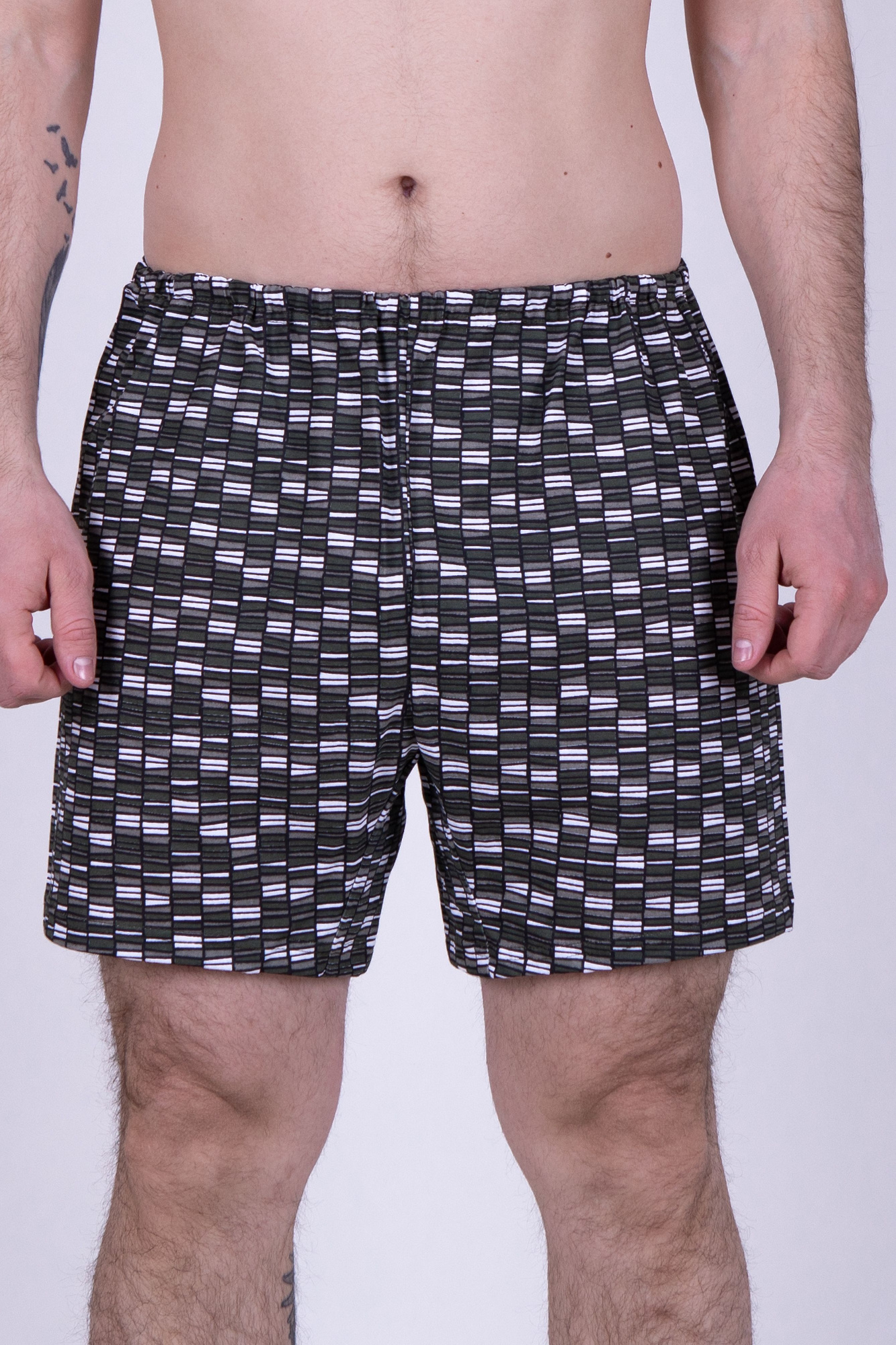 Шорты удлиненные комфортной посадки выполнены из оригинального полотна в мелкую графику. Трусы дополнены имиджевой пришивной резинкой.