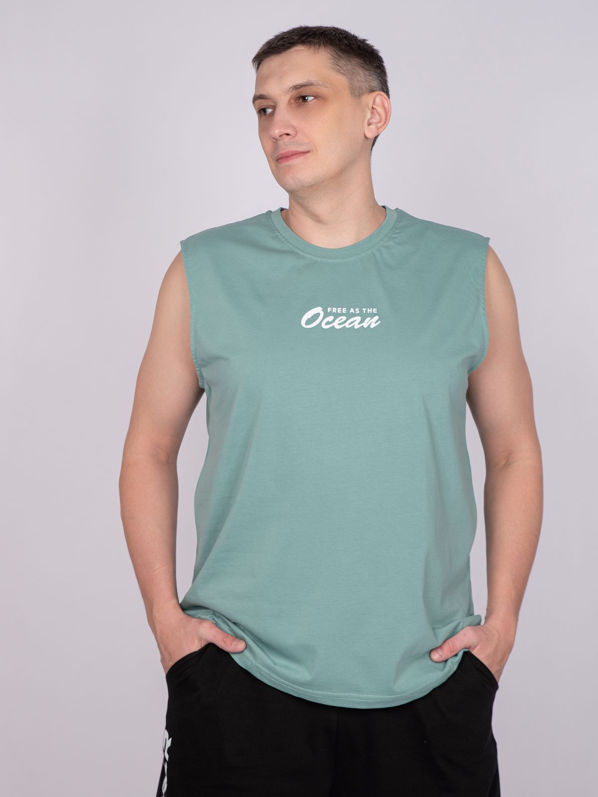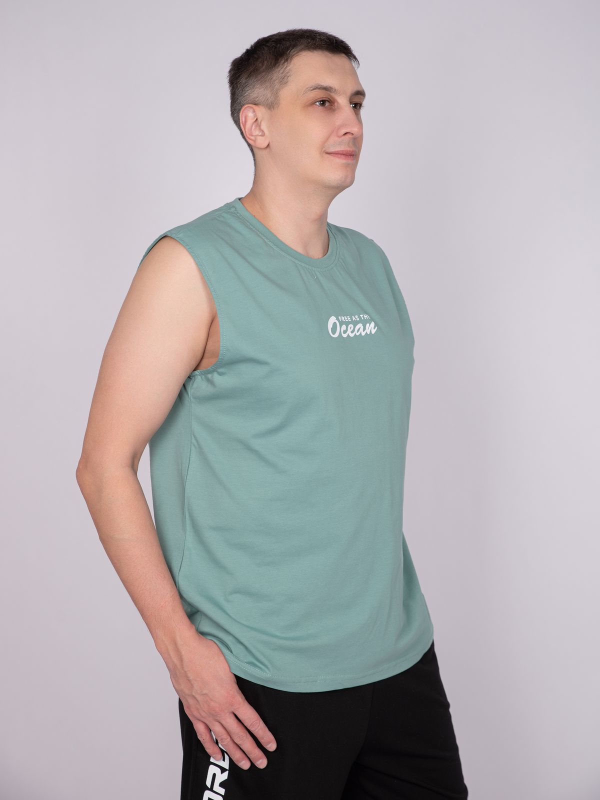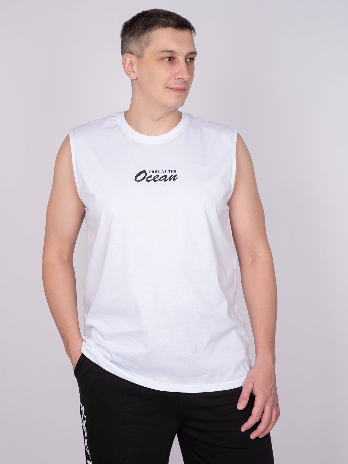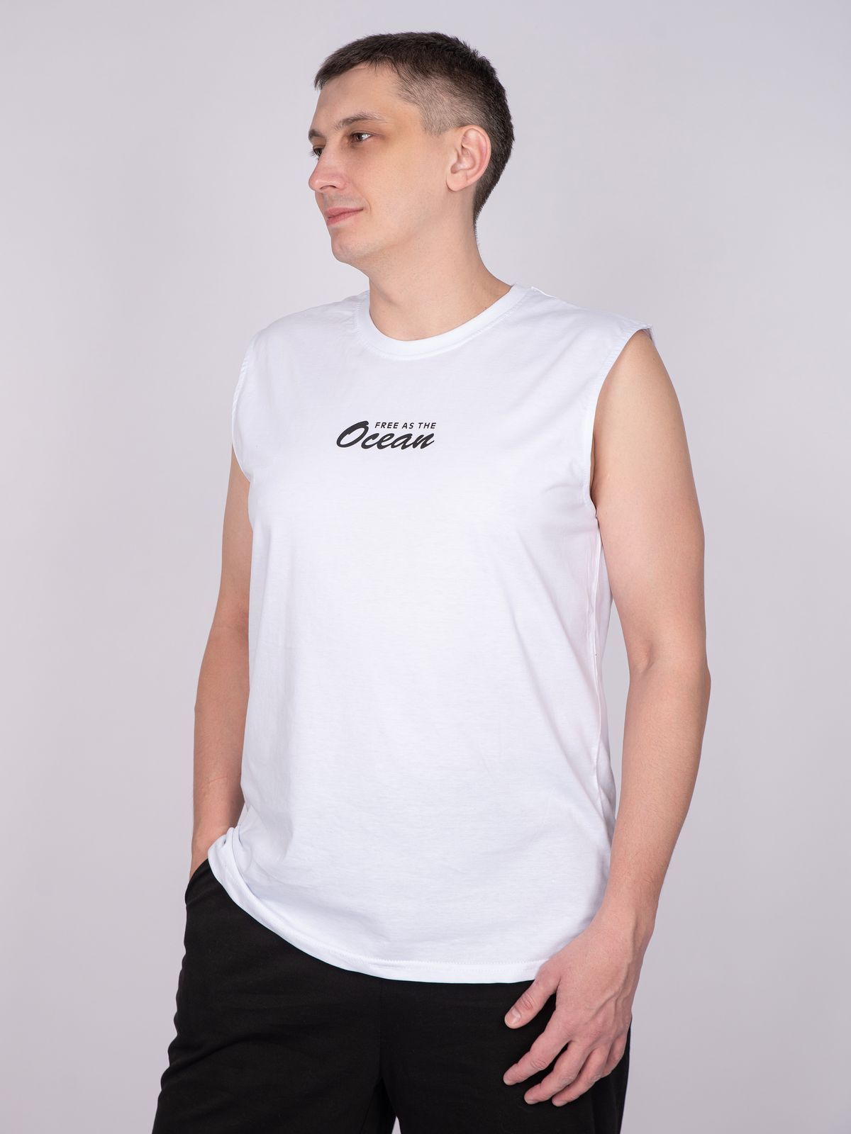 Майка мужская прямого силуэта. Горловина круглая, обработана воротником из рибаны. Горловина спинки внутри укреплена бейкой из кулирки. Низ изделия и рукавов обработан швом вподгибку. На полочке принт ШЕЛКОГРАФИЯ. Надпись переводится как "Свободен как океан". Модель рассчитана на рост 176-182.