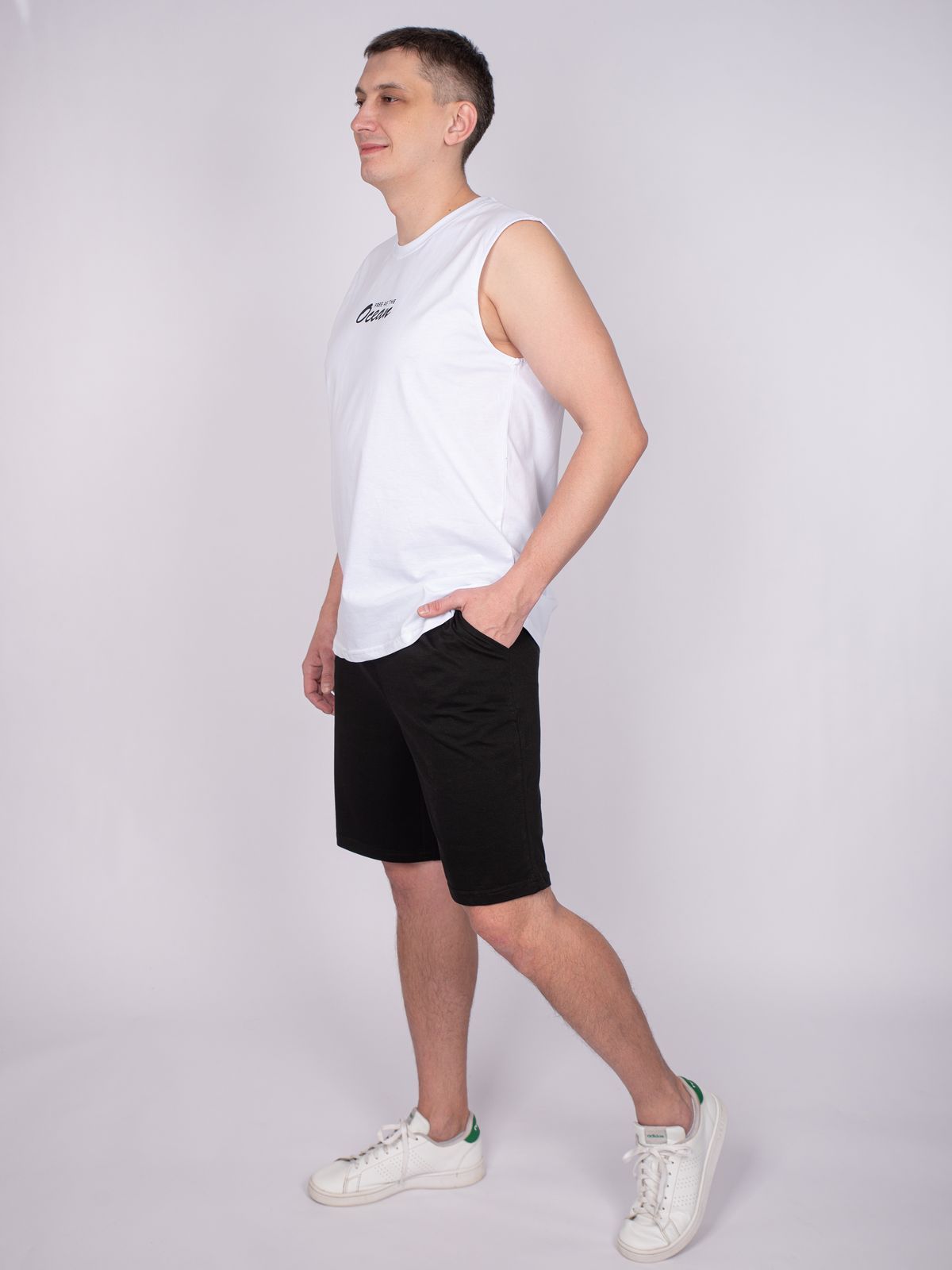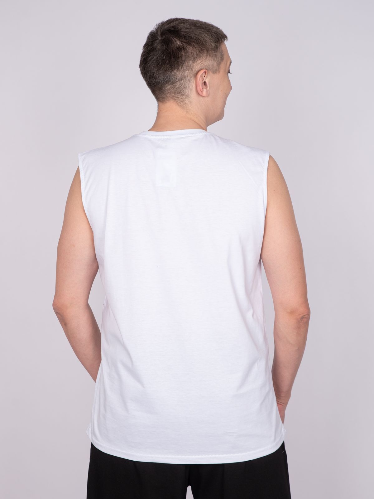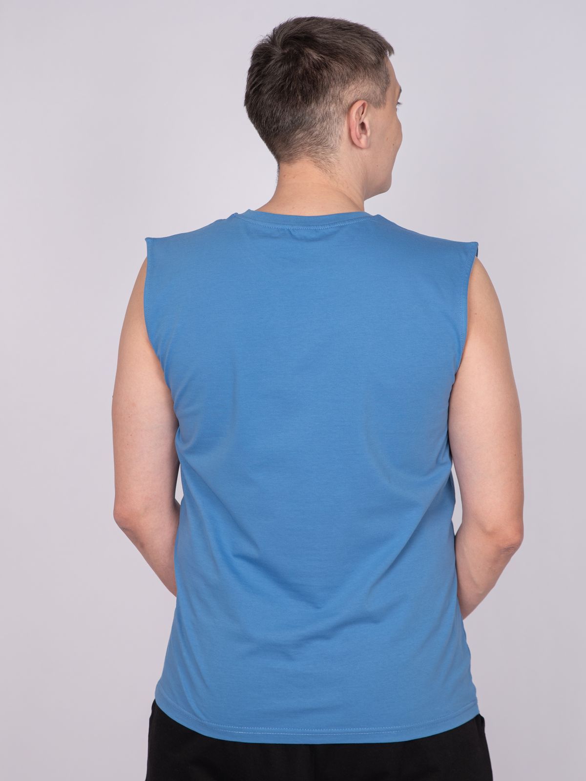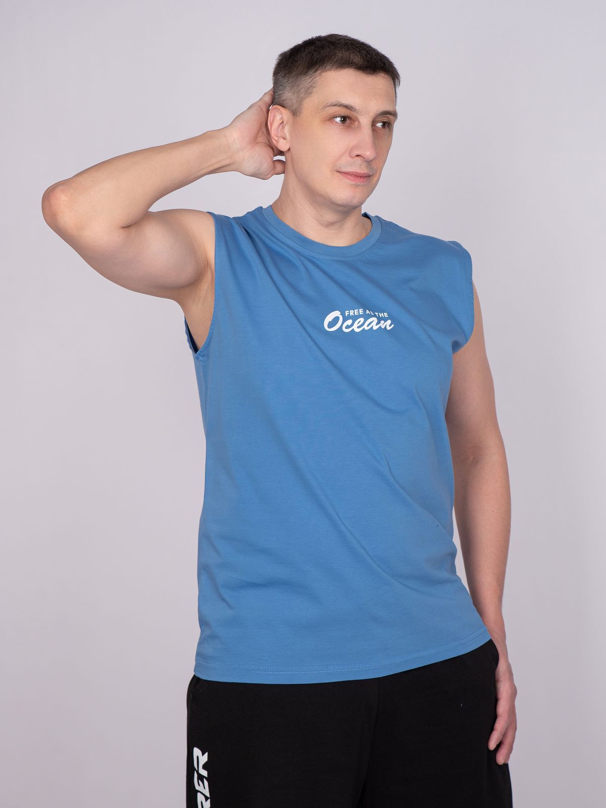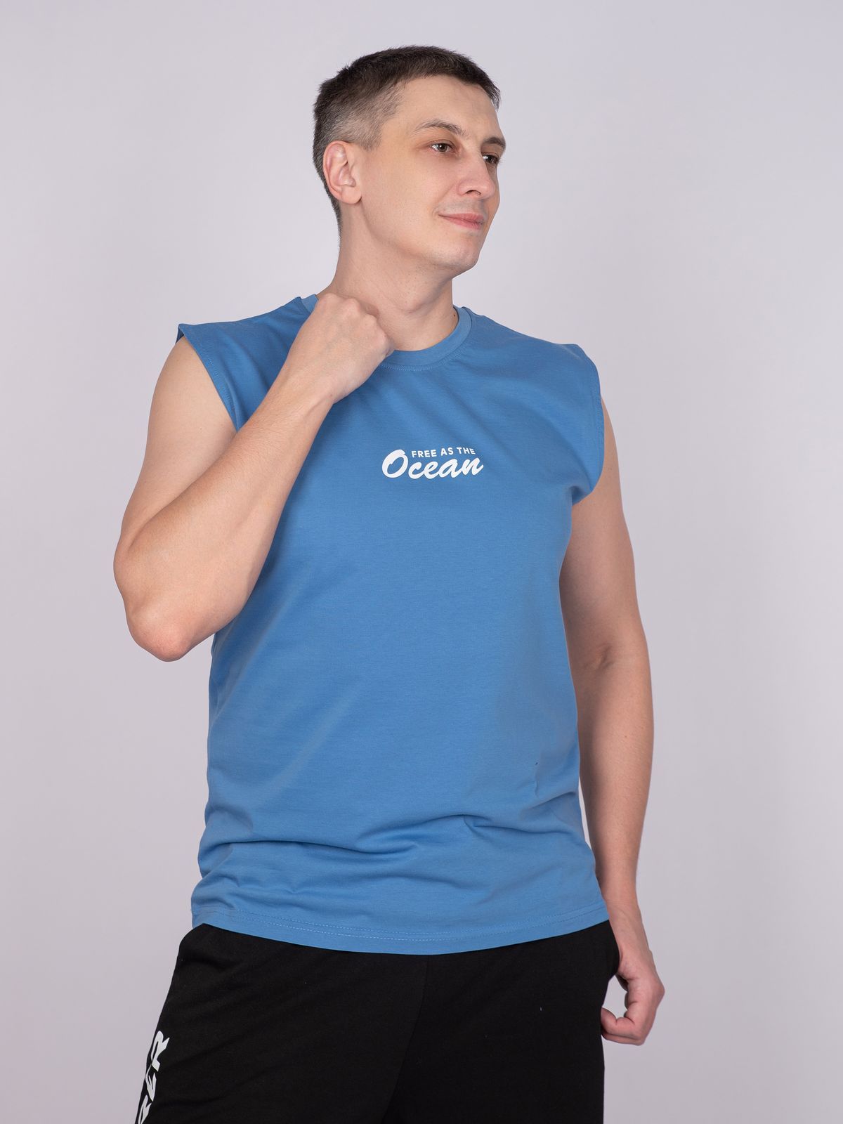 Майка мужская прямого силуэта. Горловина круглая, обработана воротником из рибаны. Горловина спинки внутри укреплена бейкой из кулирки. Низ изделия и рукавов обработан швом вподгибку. На полочке принт ШЕЛКОГРАФИЯ. Надпись переводится как "Свободен как океан". Модель рассчитана на рост 176-182.