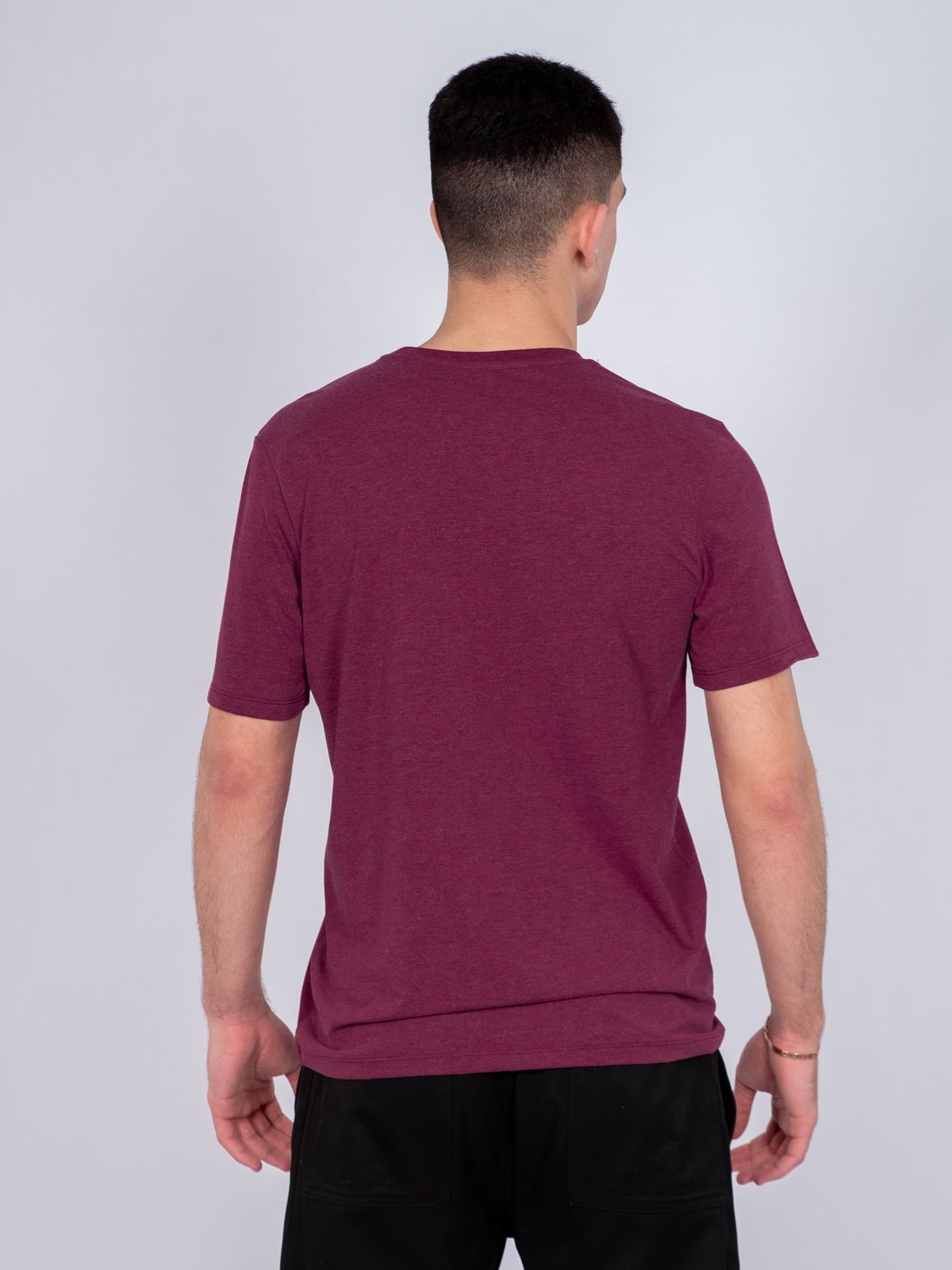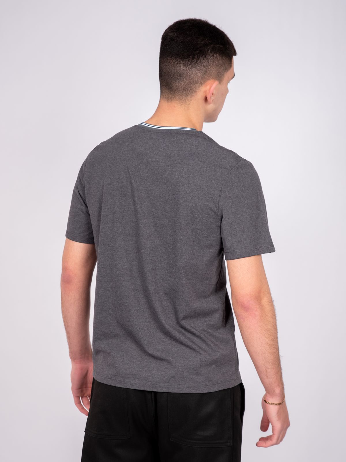 Футболка мужская из кулирки. Горловина обработана рибаной. Росток спинки обработан бейкой из кулирки. Рукав втачной, короткий.