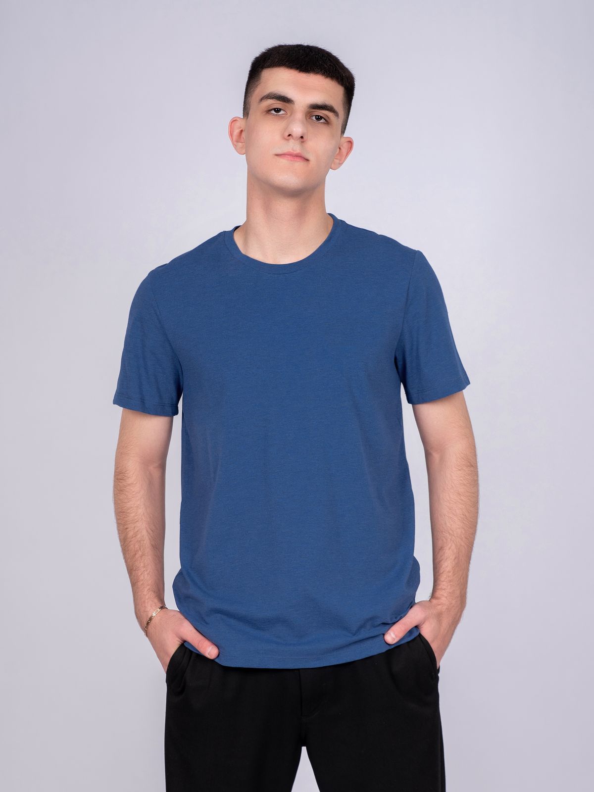 Футболка взрослая прямого силуэта с втачным коротким рукавом. Горловина круглая, обработана воротником из рибаны. По горловине полочки и спинки отделочная строчка в цвет изделия. Низ изделия и рукавов обработан швом в подгибку. Модель рассчитана на рост 176-182см.