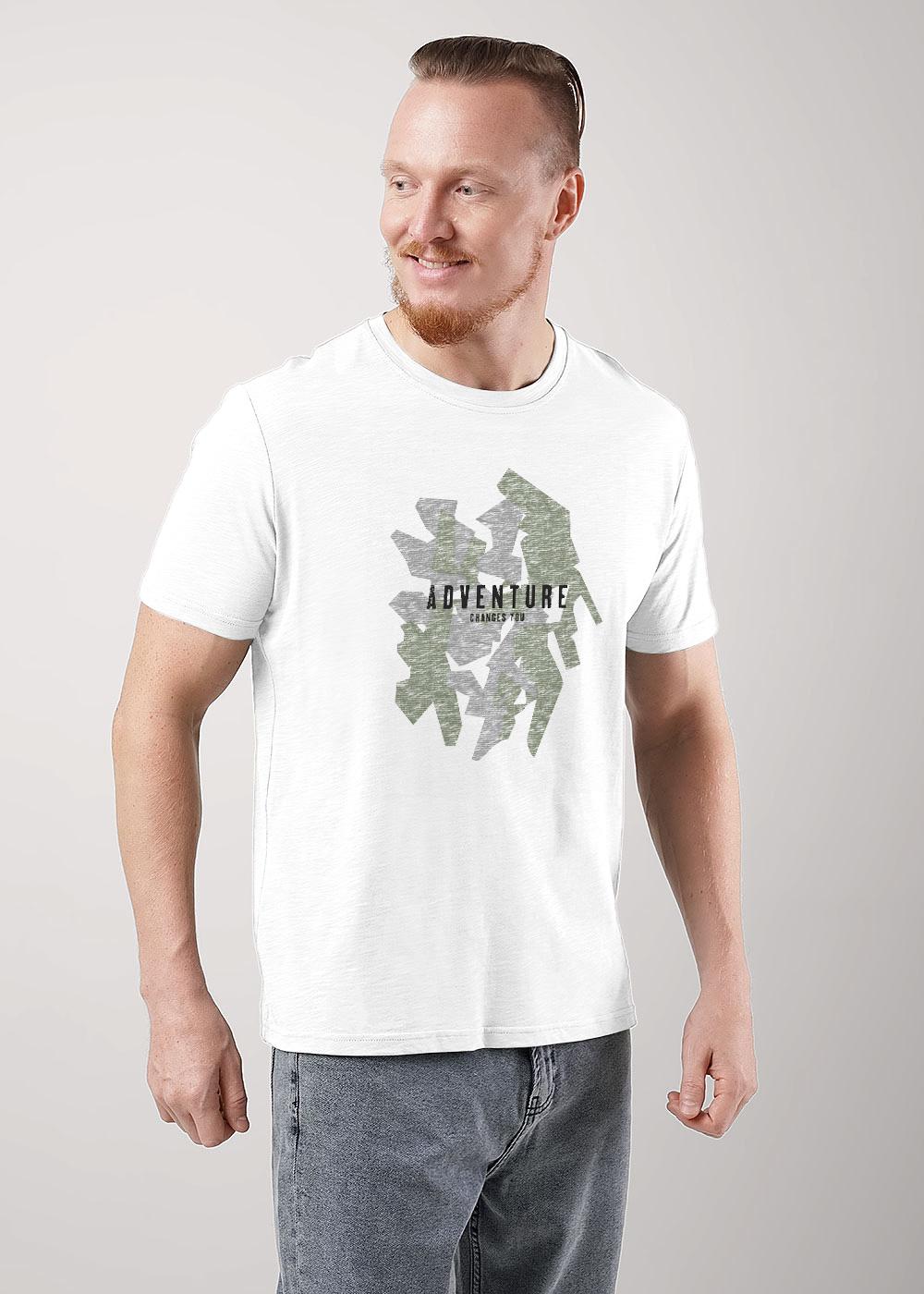 Футболка мужская прямого силуэта с втачным коротким рукавом. Горловина V-образная, обработана воротником из рибаны. Горловина спинки внутри укреплена бейкой из кулирки. По горловине полочки отделочная строчка. Низ изделия и рукавов обработан швом в подгибку. На полочке фотопринт. Надпись переводится как "Все возвращается к реке". Модель рассчитана на рост 176-182см.