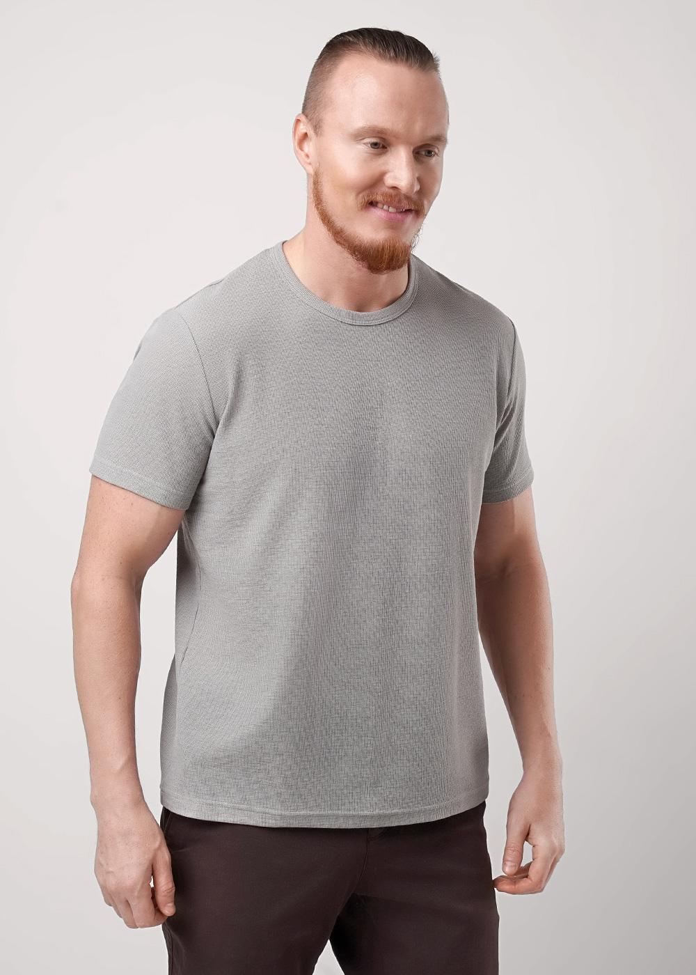 Футболка мужская с круглым вырезом горловины и коротким втачным рукавом из фактурного полотна "вафелька". Изделие дополняет имиджевая фурнитура. Подойдет к любым брюкам или джинсам.