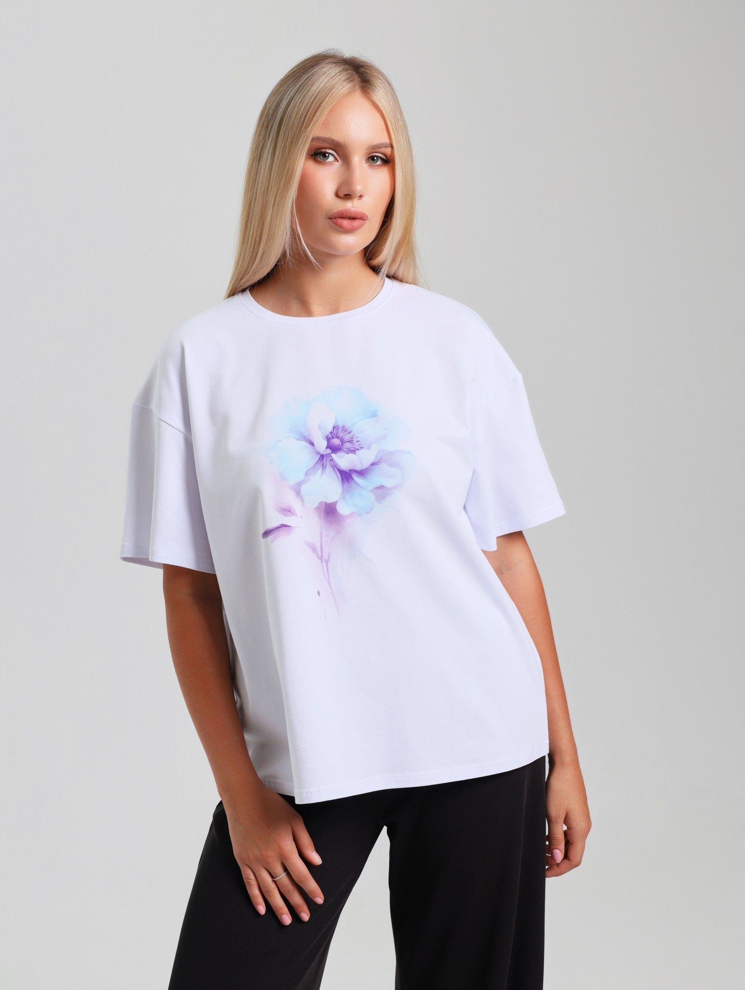 Костюм женский из трикотажного полотна "кулирка" в комбинации двух видов: гладкокрашеного и набивного с тематическим рисунком, состоящий из футболки и шорт. Футболка из гладкокрашеного полотна, с цельнокроенными короткими рукавами, горловиной овальной формы, обработанной втачной планкой и отделочной строчкой. В центре переда - принт, выполненгный в технике шелкографии. Шорты из полотна с набивным рисунком, свободного силуэта, на цельнокроенном поясе с эластичной тесьмой внутри.