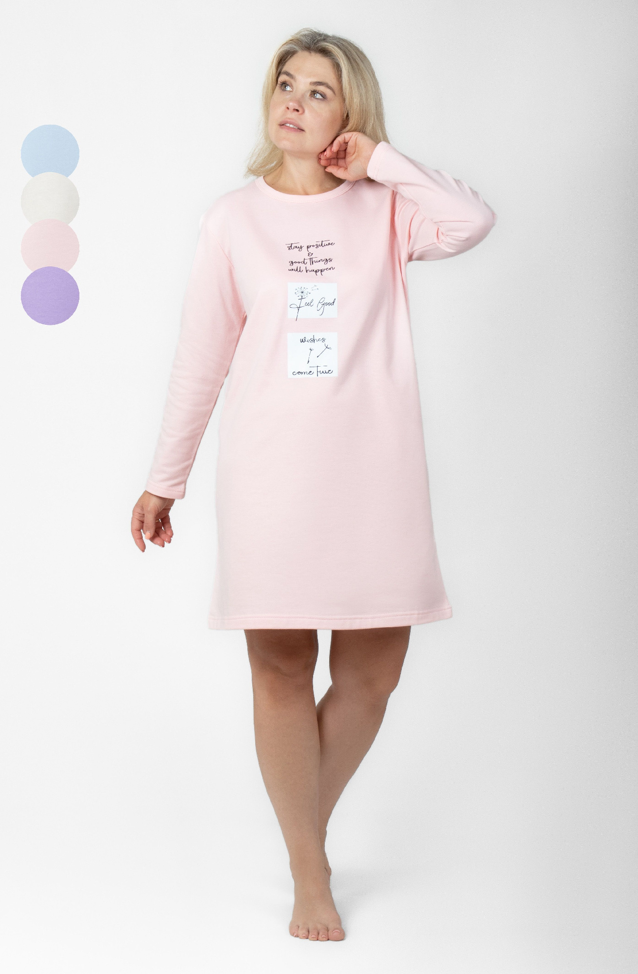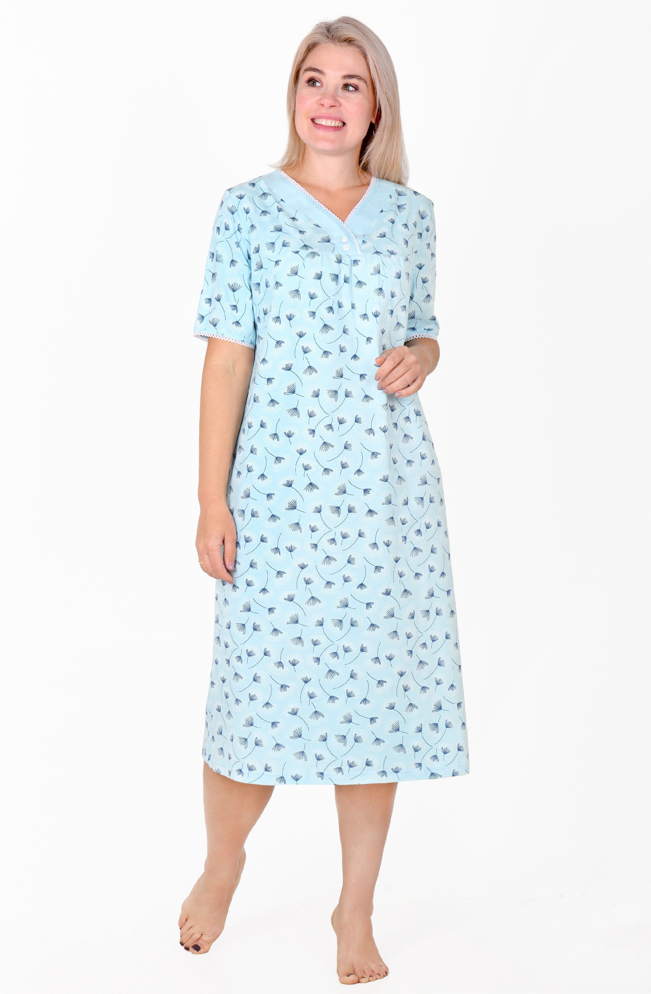 Халат женский из трикотажного полотна «кулирка» с набивным рисунком полуприлегающего силуэта, с горловиной овальной формы, окантованной основным материалом, короткими втачными рукавами с притачными манжетами. В боковых швах, смещенных в сторону полочки, обработаны карманы.