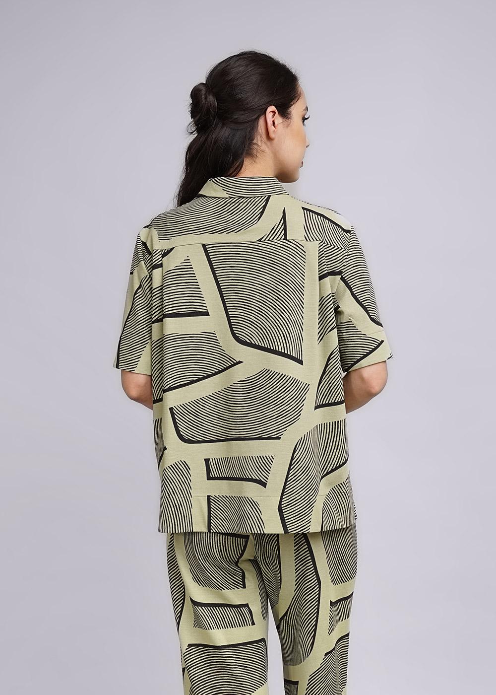Укороченная рубашка из ткани пике свободного кроя. Планка с застежкой на пуговицы. Отложной воротник. Короткий, втачной рукав. По бокам разрезы. На детали спинки кокетка со складками.